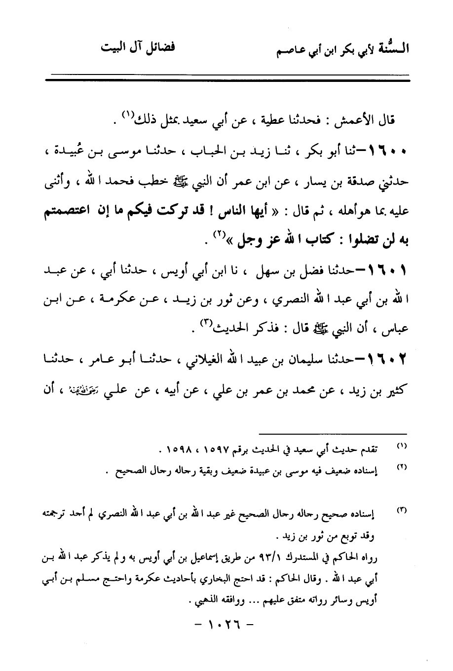 1600 - حَدَّثنا أَبُو بَكْرٍ، حَدَّثنا زَيْدُ بْنُ الْحُبَابِ، حَدَّثنا مُوسَى بْنُ عُبَيْدَةَ، حَدَّثَنِي صَدَقَةُ بْنُ يَسَارٍ، عَنِ ابْنِ عُمَرَ، أَنَّ النَّبِيَّ صَلى الله عَلَيهِ وسَلمَ خَطَبَ، فَحَمِدَ اللهَ وَأَثْنَى عَلَيْهِ بِمَا هُوَ أَهْلُهُ، ثُمَّ قَالَ: أَيُّهَا النَّاسُ, قَدْ تَرَكْتُ فِيكُمْ مَا إِنِ اعْتَصَمْتُمْ بِهِ لَنْ تَضِلُّوا: كِتَابَ اللهِ عَزَّ وَجَلَّ.
