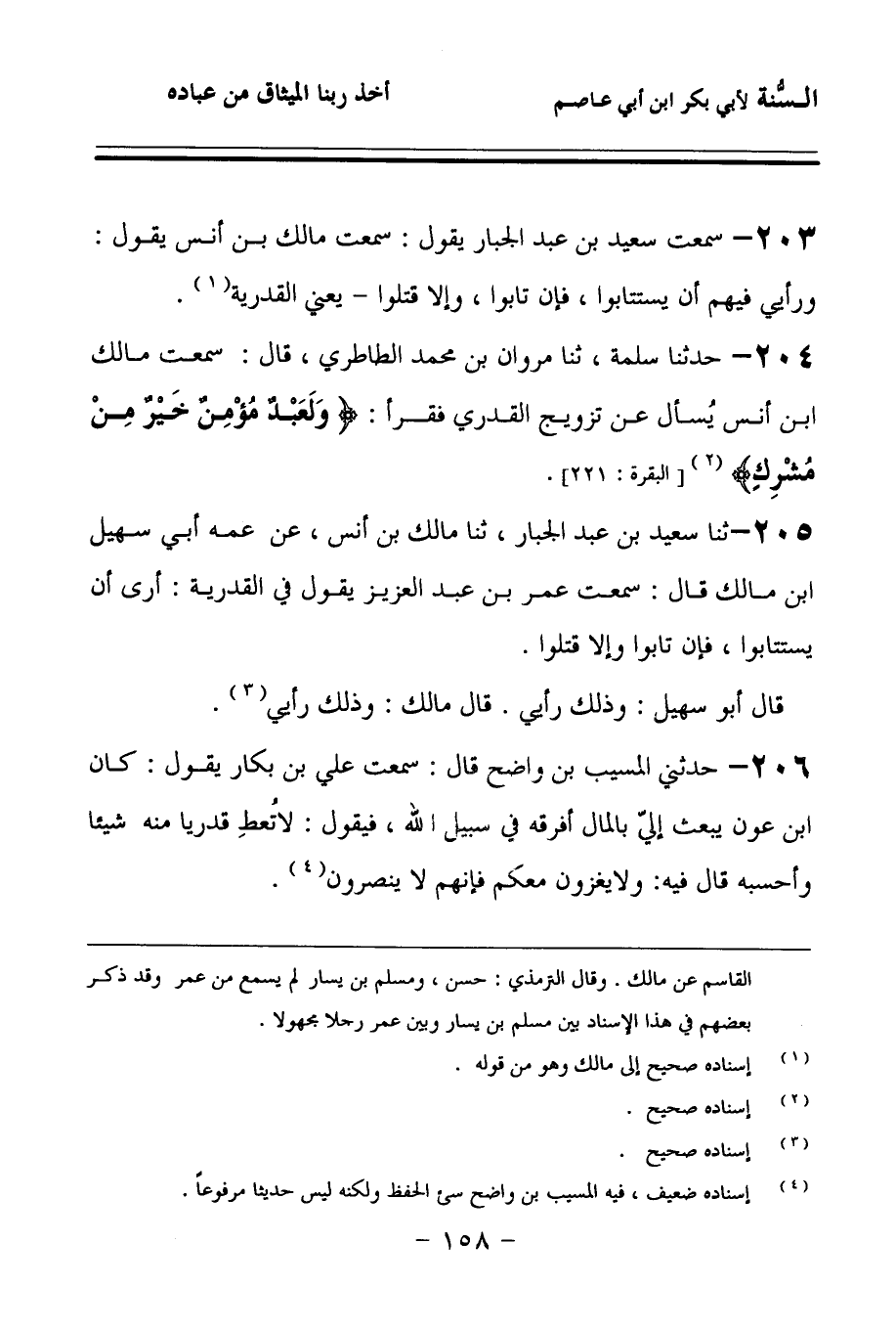 203 - سَمِعْتُ سَعِيدَ بْنَ عَبْدِ الْجَبَّارِ يَقُولُ: سَمِعْتُ مَالِكَ بْنَ أَنَسٍ، يَقُولُ: وَرَأْيِي فِيهِمْ أَنْ يُسْتَتَابُوا، فَإِنْ تَابُوا وَإِلاَّ قُتِلُوا، يَعْنِي الْقَدَرِيَّةَ.