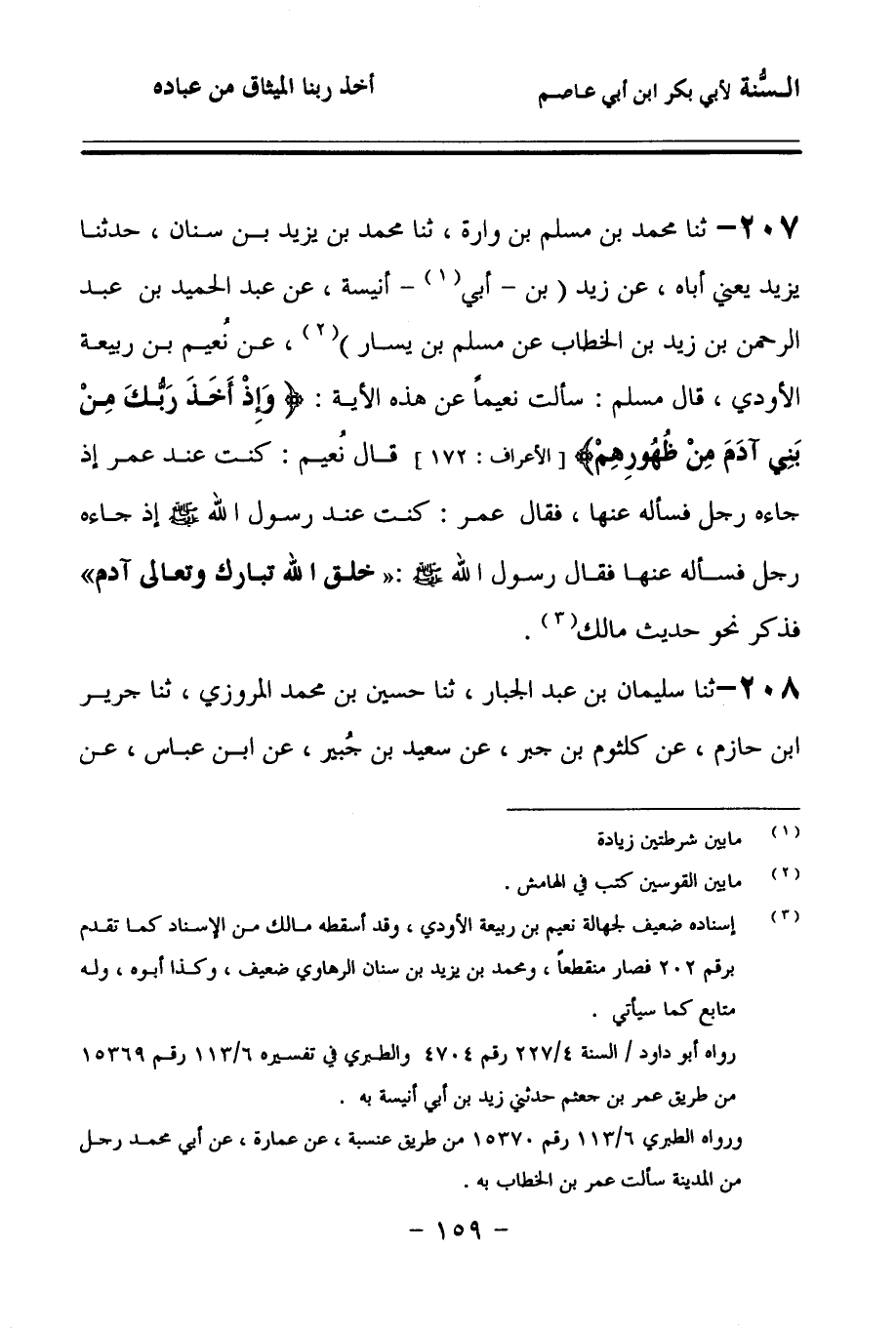 207 - حَدَّثنا مُحَمَّدُ بْنُ مُسْلِمِ بْنِ وَارَةَ، حَدَّثنا مُحَمَّدُ بْنُ يَزِيدَ بْنِ سِنَانٍ، حَدَّثنا يَزِيدُ، يَعْنِي أَبَاهُ، عَنْ زَيْدِ بْنِ أَبِي أُنَيْسَةَ، عَنْ عَبْدِ الْحَمِيدِ بْنِ عَبْدِ الرَّحْمَنِ بْنِ زَيْدِ بْنِ الْخَطَّابِ، عَنْ مُسْلِمِ بْنِ يَسَارٍ، عَنْ نُعَيْمِ بْنِ رَبِيعَةَ الأَوْدِيِّ، قَالَ مُسْلِمٌ: سَأَلْتُ نُعَيْمًا عَنْ هَذِهِ الآيَةِ: {وَإِذْ أَخَذَ رَبُّكَ مِنْ بَنِي آدَمَ مِنْ ظُهُورِهِمْ} قَالَ نُعَيْمٌ: كُنْتُ عِنْدَ عُمَرَ, إِذْ جَاءَهُ رَجُلٌ, فَسَأَلَهُ عَنْهَا، فَقَالَ عُمَرُ: كُنْتُ عِنْدَ رَسُولِ اللهِ صَلى الله عَلَيهِ وسَلمَ, إِذْ جَاءَهُ رَجُلٌ, فَسَأَلَهُ عَنْهَا، فَقَالَ رَسُولُ اللهِ صَلى الله عَلَيهِ وسَلمَ: خَلَقَ اللهُ تَبَارَكَ وَتَعَالَى آدَمَ، فَذَكَرَ نَحْوَ حَدِيثِ مَالِكٍ.