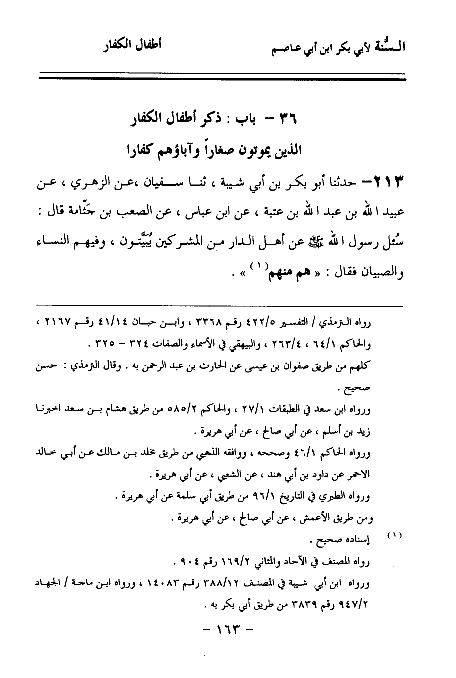 213 - حَدَّثنا أَبُو بَكْرِ بْنُ أَبِي شَيْبَةَ، حَدَّثنا سُفْيَانُ، عَنِ الزُّهْرِيِّ، عَنْ عُبَيْدِ اللهِ بْنِ عَبْدِ اللهِ بْنِ عُتْبَةَ، عَنِ ابْنِ عَبَّاسٍ، عَنِ الصَّعْبِ بْنِ جَثَّامَةَ، قَالَ: سُئِلَ رَسُولُ اللهِ صَلى الله عَلَيهِ وسَلمَ عَنْ أَهْلِ الدَّارِ مِنَ الْمُشْرِكِينَ يُبَيَّتُونَ وَفِيهِمُ النِّسَاءُ وَالصِّبْيَانُ، فَقَالَ: هُمْ مِنْهُمْ.