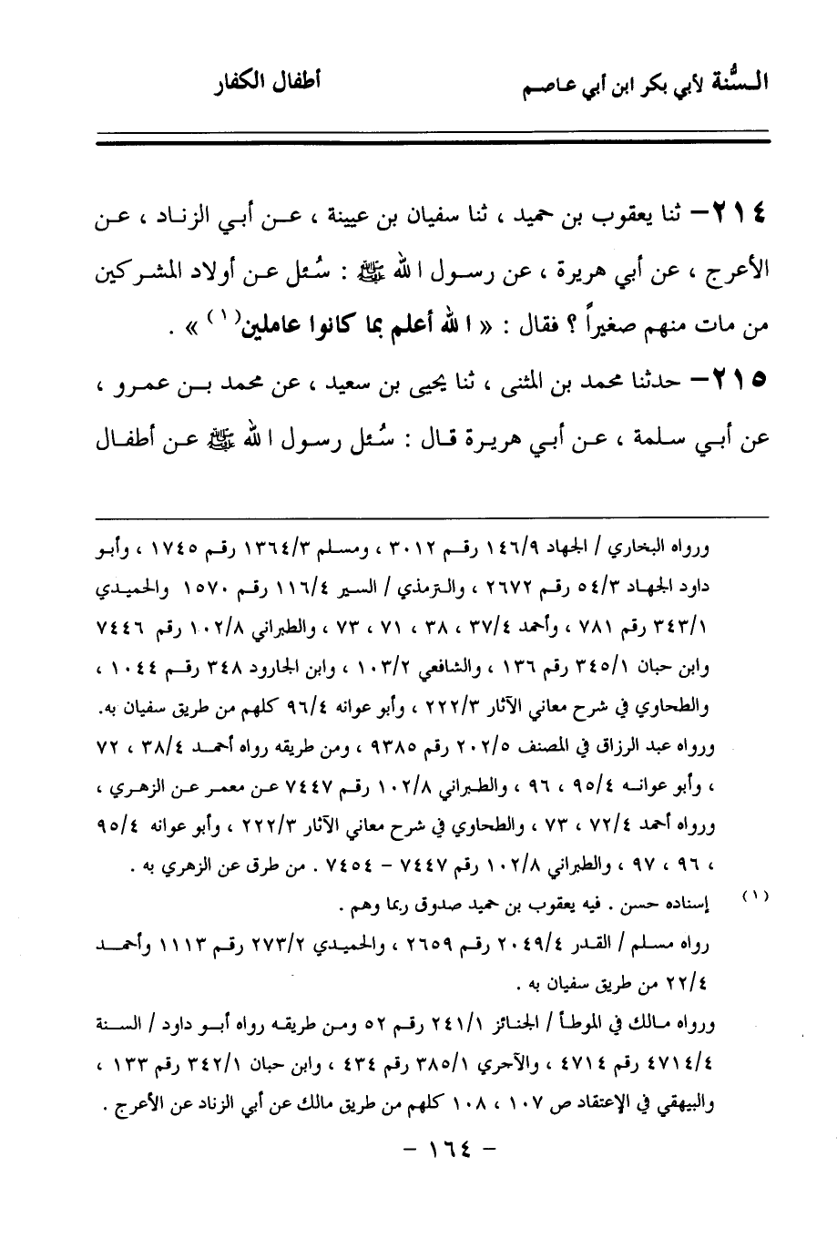 214 - حَدَّثنا يَعْقُوبُ بْنُ حُمَيْدٍ، حَدَّثنا سُفْيَانُ بْنُ عُيَيْنَةَ، عَنْ أَبِي الزِّنَادِ، عَنِ الأَعْرَجِ، عَنْ أَبِي هُرَيْرَةَ، عَنْ رَسُولِ اللهِ صَلى الله عَلَيهِ وسَلمَ, سُئِلَ عَنْ أَوْلاَدِ الْمُشْرِكِينَ مَنْ مَاتَ مِنْهُمْ صَغِيرًا، فَقَالَ: اللهُ أَعْلَمُ بِمَا كَانُوا عَامِلِينَ.