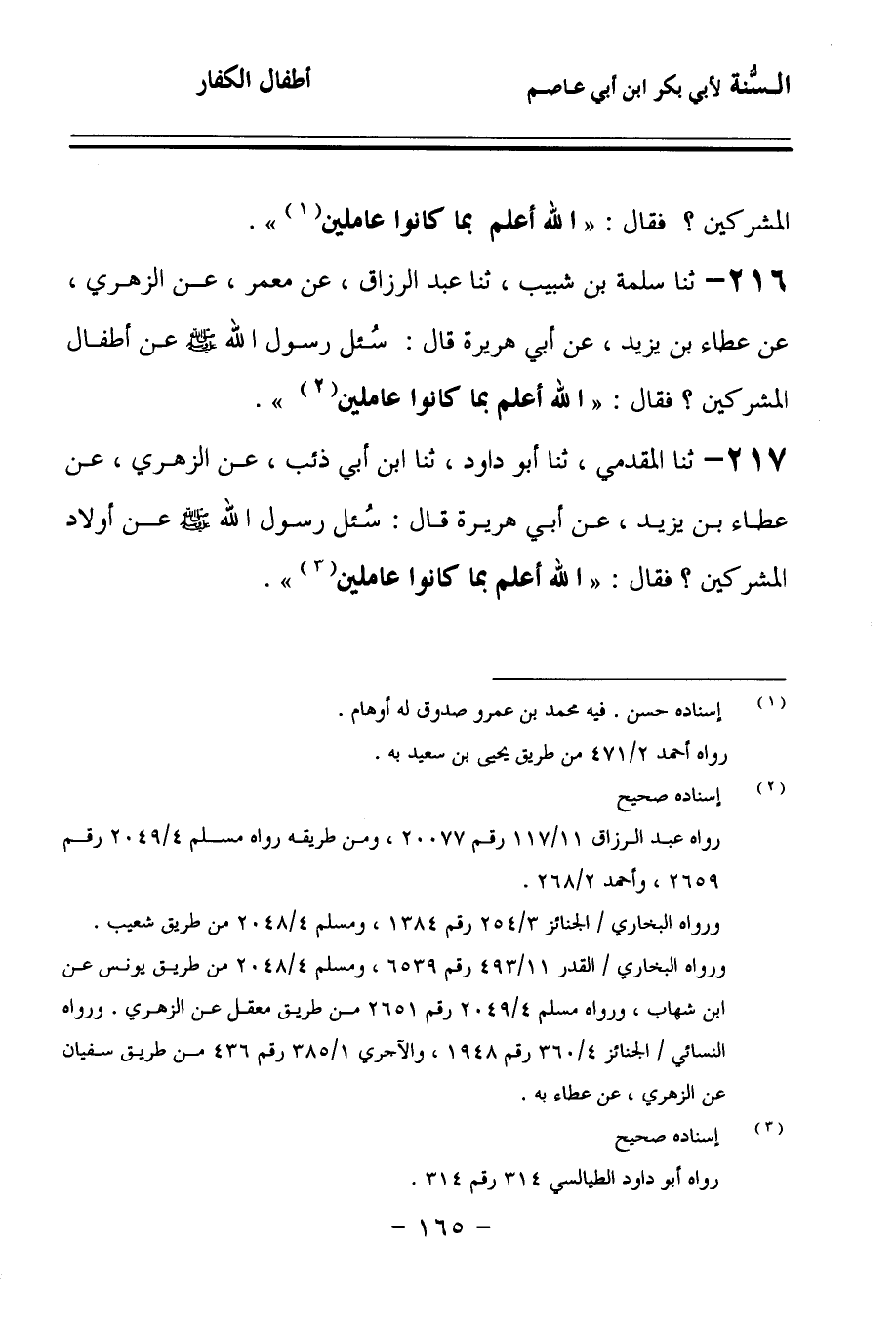216 - حَدَّثنا سَلَمَةُ بْنُ شَبِيبٍ، حَدَّثنا عَبْدُ الرَّزَّاقِ، عَنْ مَعْمَرٍ، عَنِ الزُّهْرِيِّ، عَنْ عَطَاءِ بْنِ يَزِيدَ، عَنْ أَبِي هُرَيْرَةَ، قَالَ: سُئِلَ رَسُولُ اللهِ صَلى الله عَلَيهِ وسَلمَ عَنْ أَطْفَالِ الْمُشْرِكِينَ, فَقَالَ: اللهُ أَعْلَمُ بِمَا كَانُوا عَامِلِينَ.