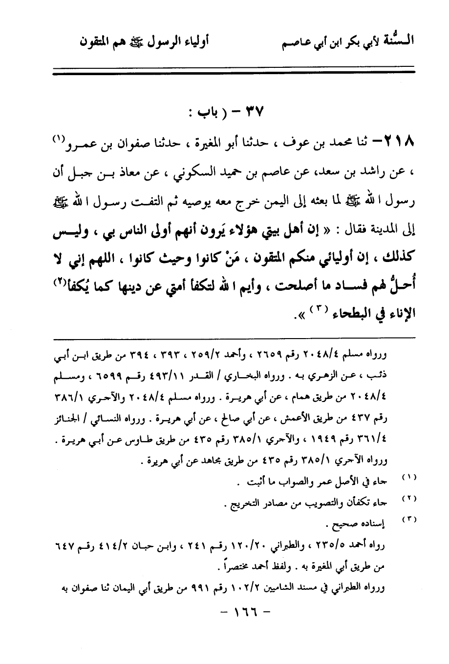 218 - حَدَّثنا مُحَمَّدُ بْنُ عَوْفٍ، حَدَّثنا أَبُو الْمُغِيرَةِ، حَدَّثنا صَفْوَانُ بْنُ عَمْرٍو، عَنْ رَاشِدِ بْنِ سَعْدٍ، عَنْ عَاصِمِ بْنِ حُمَيْدٍ السَّكُونِيِّ، عَنْ مُعَاذِ بْنِ جَبَلٍ، أَنَّ رَسُولَ اللهِ صَلى الله عَلَيهِ وسَلمَ لَمَّا بَعَثَهُ إِلَى الْيَمَنِ, خَرَجَ مَعَهُ يُوصِيهِ، ثُمَّ الْتَفَتَ رَسُولُ اللهِ صَلى الله عَلَيهِ وسَلمَ إِلَى الْمَدِينَةِ, فَقَالَ: إِنَّ أَهْلَ بَيْتِي هَؤُلاَءِ يَرَوْنَ أَنَّهُمْ أَوْلَى النَّاسِ بِي، وَلَيْسَ كَذَلِكَ، إِنَّ أَوْلِيَائِي مِنْكُمُ الْمُتَّقُونَ، مَنْ كَانُوا, وَحَيْثُ كَانُوا، اللهُمَّ إِنِّي لاَ أُحِلُّ لَهُمْ فَسَادَ مَا أَصْلَحْتُ، وَايْمُ اللهِ لَتُكْفَأَ أُمَّتِي عَنْ دِينِهَا كَمَا يُكْفَأَ الإِنَاءُ فِي الْبَطْحَاءِ.