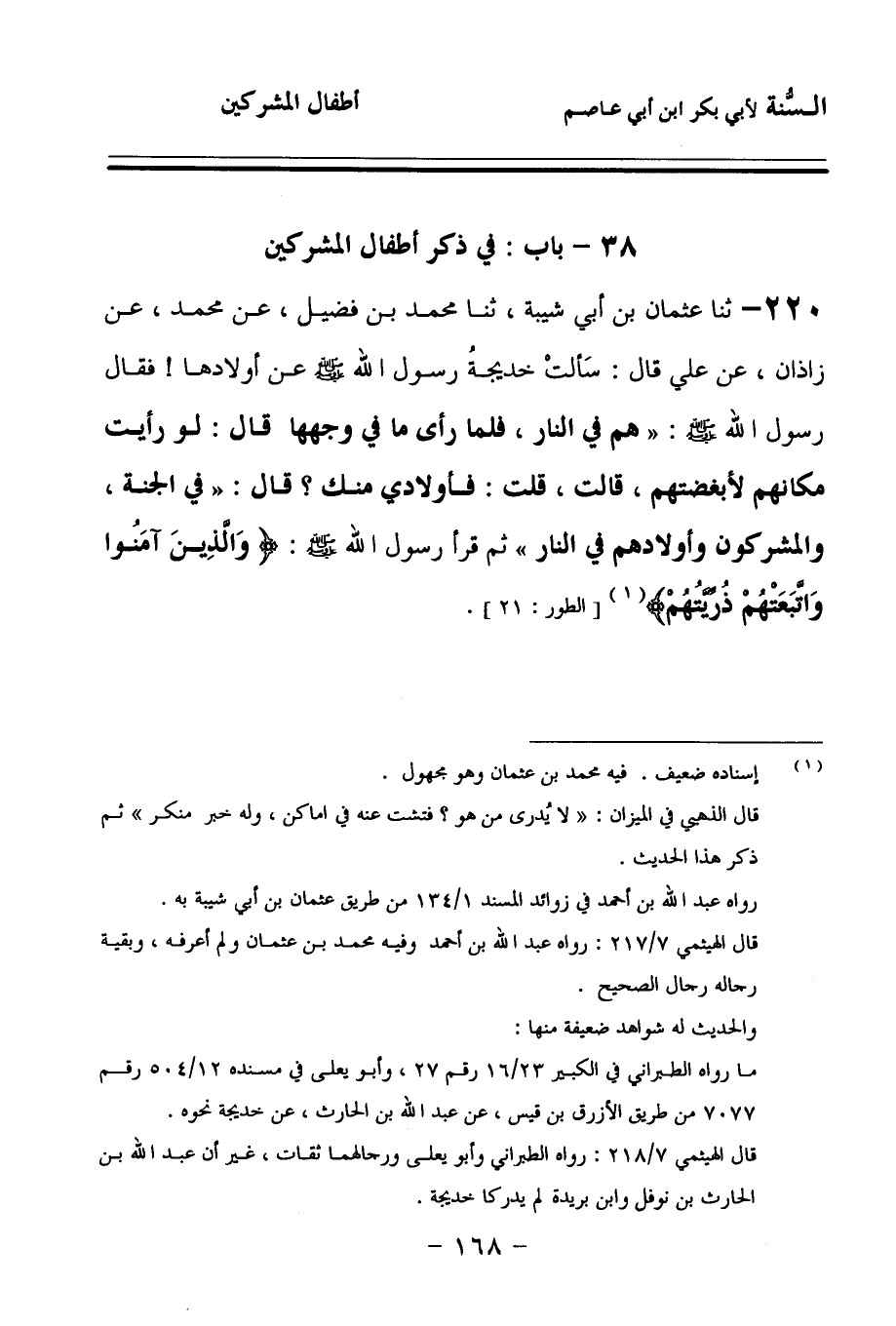220 - حَدَّثنا عُثْمَانُ بْنُ أَبِي شَيْبَةَ، حَدَّثنا مُحَمَّدُ بْنُ فُضَيْلٍ، عَنْ مُحَمَّدٍ، عَنْ زَاذَانَ، عَنْ عَلِيٍّ، قَالَ: سَأَلَتْ خَدِيجَةُ رَسُولَ اللهِ صَلى الله عَلَيهِ وسَلمَ عَنْ أَوْلاَدِهَا، فَقَالَ رَسُولُ اللهِ صَلى الله عَلَيهِ وسَلمَ: هُمْ فِي النَّارِ، فَلَمَّا رَأَى مَا فِي وَجْهِهَا, قَالَ: لَوْ رَأَيْتِ مَكَانَهُمْ لأَبْغَضْتِهِمْ، قَالَتْ: قُلْتُ: فَأَوْلاَدِي مِنْكَ؟ قَالَ: فِي الْجَنَّةِ، وَالْمُشْرِكُونَ وَأَوْلاَدُهُمْ فِي النَّارِ، ثُمَّ قَرَأَ رَسُولُ اللهِ صَلى الله عَلَيهِ وسَلمَ: {وَالَّذِينَ آمَنُوا وَاتَّبَعَتْهُمْ ذُرِّيَّتُهُمْ}.
