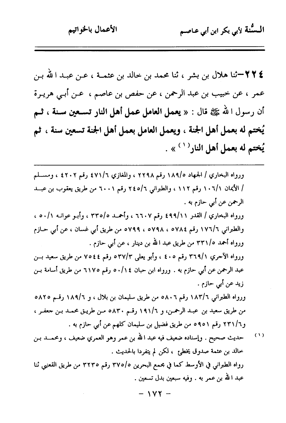 224 - حَدَّثنا هِلاَلُ بْنُ بِشْرٍ، حَدَّثنا مُحَمَّدُ بْنُ خَالِدِ بْنِ عَثْمَةَ، عَنْ عَبْدِ اللهِ بْنِ عُمَرَ، عَنْ خُبَيْبِ بْنِ عَبْدِ الرَّحْمَنِ، عَنْ حَفْصِ بْنِ عَاصِمٍ، عَنْ أَبِي هُرَيْرَةَ، أَنَّ رَسُولَ اللهِ صَلى الله عَلَيهِ وسَلمَ قَالَ: يَعْمَلُ الْعَامِلُ عَمَلَ أَهْلِ النَّارِ تِسْعِينَ سَنَةً، ثُمَّ يُخْتَمُ لَهُ بِعَمَلِ أَهْلِ الْجَنَّةِ، وَيَعْمَلُ الْعَامِلُ بِعَمَلِ أَهْلِ الْجَنَّةِ تِسْعِينَ سَنَةً، ثُمَّ يُخْتَمُ لَهُ بِعَمَلِ أَهْلِ النَّارِ.
