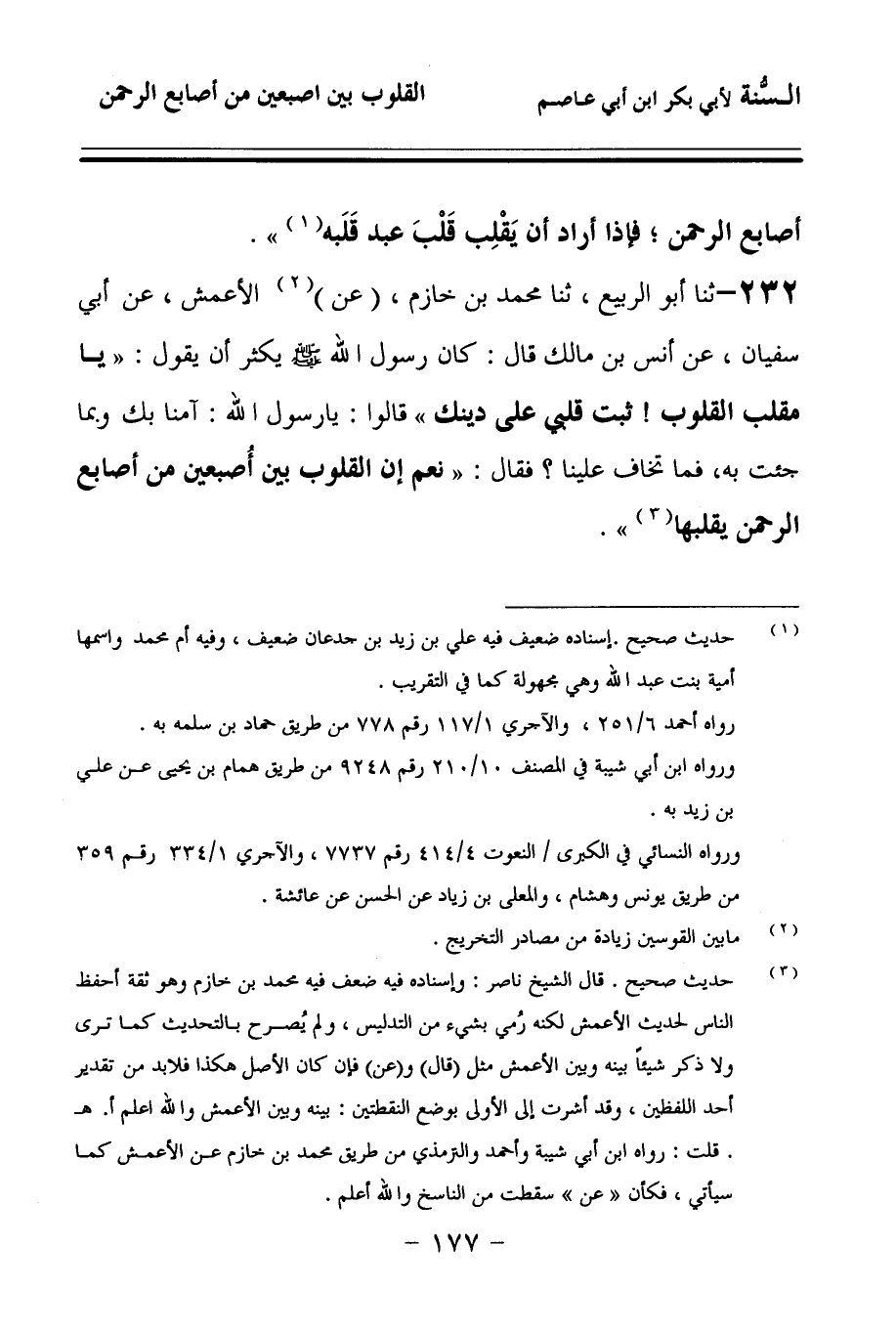 232 - حَدَّثنا أَبُو الرَّبِيعِ، حَدَّثنا مُحَمَّدُ بْنُ خَازِمٍ, عَنِ الأَعْمَشِ، عَنْ أَبِي سُفْيَانَ، عَنْ أَنَسِ بْنِ مَالِكٍ، قَالَ: كَانَ رَسُولُ اللهِ صَلى الله عَلَيهِ وسَلمَ يُكْثِرُ أَنْ يَقُولَ: يَا مُقَلِّبَ الْقُلُوبِ، ثَبِّتْ قَلْبِي عَلَى دَيْنِكَ، قَالُوا: يَا رَسُولَ اللهِ, آمَنَّا بِكَ وَبِمَا جِئْتَ بِهِ، فَمَا تَخَافُ عَلَيْنَا؟ فَقَالَ: نَعَمْ, إِنَّ الْقُلُوبَ بَيْنَ أُصْبُعَيْنِ مِنْ أَصَابِعِ الرَّحْمَنِ, يُقَلِّبُهَا.