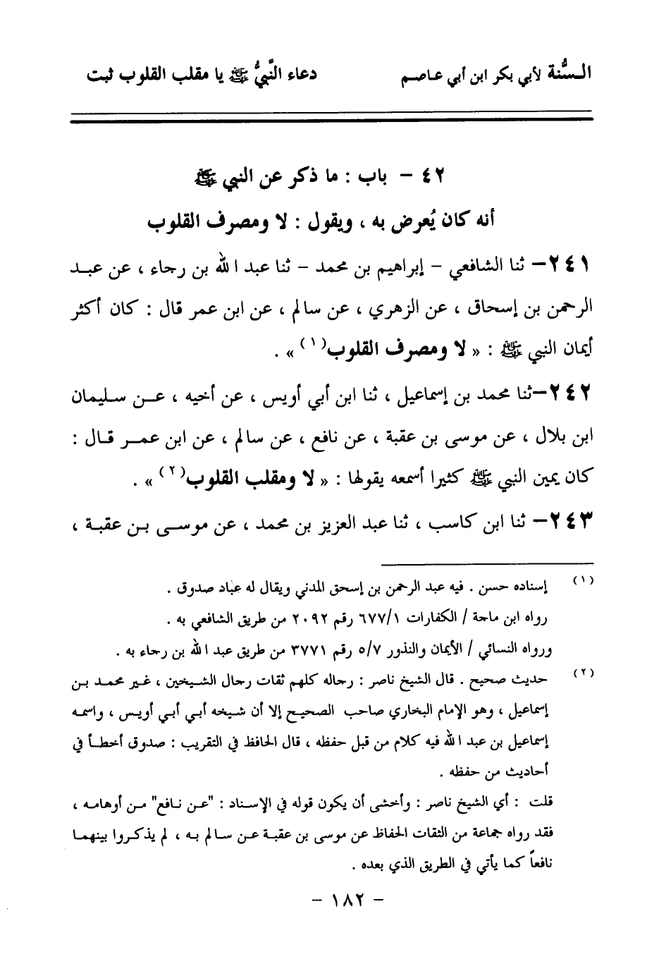 241 - حَدَّثنا الشَّافِعِيُّ إِبْرَاهِيمُ بْنُ مُحَمَّدٍ، حَدَّثنا عَبْدُ اللهِ بْنُ رَجَاءٍ، عَنْ عَبْدِ الرَّحْمَنِ بْنِ إِسْحَاقَ، عَنِ الزُّهْرِيِّ، عَنْ سَالِمٍ، عَنِ ابْنِ عُمَرَ، قَالَ: كَانَ أَكْثَرَ أَيْمَانِ النَّبِيِّ صَلى الله عَلَيهِ وسَلمَ: لاَ، وَمُصَرِّفِ الْقُلُوبِ.