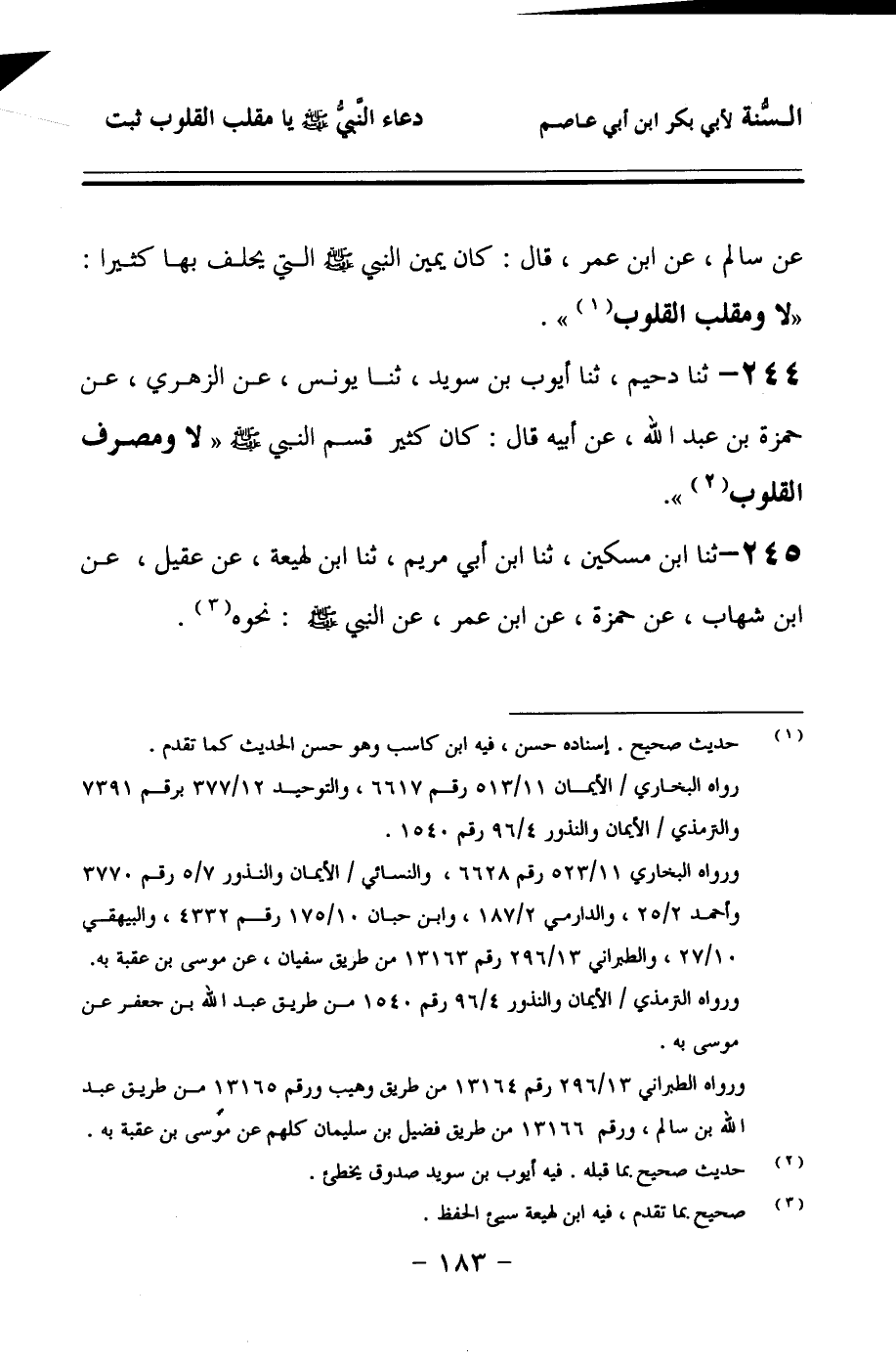 244 - حَدَّثنا دُحَيْمٌ، حَدَّثنا أَيُّوبُ بْنُ سُوَيْدٍ، حَدَّثنا يُونُسُ، عَنِ الزُّهْرِيِّ، عَنْ حَمْزَةَ بْنِ عَبْدِ اللهِ، عَنْ أَبِيهِ، قَالَ: كَانَ كَثِيرُ قَسَمِ النَّبِيِّ صَلى الله عَلَيهِ وسَلمَ: لاَ، وَمُصَرِّفِ الْقُلُوبِ.