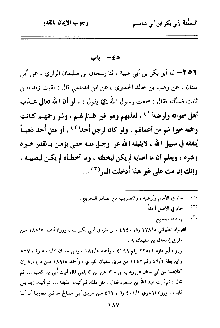 252 - حَدَّثنا أَبُو بَكْرِ بْنُ أَبِي شَيْبَةَ، حَدَّثنا إِسْحَاقُ بْنُ سُلَيْمَانَ الرَّازِيُّ، عَنْ أَبِي سِنَانٍ، عَنْ وَهْبِ بْنِ خَالِدٍ الْحِمْيَرِيِّ، عَنِ ابْنِ الدَّيْلَمِيِّ، قَالَ: لَقِيتُ زَيْدَ بْنَ ثَابِتٍ، فَسَأَلْتُهُ, فَقَالَ: سَمِعْتُ رَسُولَ اللهِ صَلى الله عَلَيهِ وسَلمَ يَقُولُ: لَوْ أَنَّ اللهَ تَعَالَى عَذَّبَ أَهْلَ سَمَاوَاتِهِ وَأَرْضِهِ, لَعَذَّبَهُمْ وَهُوَ غَيْرُ ظَالِمٍ لَهُمْ، وَلَوْ رَحِمَهُمْ كَانَتْ رَحْمَتُهُ خَيْرًا لَهُمْ مِنْ أَعْمَالِهِمْ، وَلَوْ كَانَ لِرَجُلٍ أُحُدٌ، أَوْ مِثْلُ أُحُدٍ ذَهَبًا يُنْفِقُهُ فِي سَبِيلِ اللهِ، لاَ يَقْبَلُهُ اللهُ عَزَّ وَجَلَّ مِنْهُ, حَتَّى يُؤْمِنَ بِالْقَدَرِ خَيْرِهِ وَشَرِّهِ، وَيَعْلَمَ أَنَّ مَا أَصَابَهُ لَمْ يَكُنْ لِيُخْطِئَهُ، وَمَا أَخْطَأَهُ لَمْ يَكُنْ لِيُصِيبَهُ، وَإِنَّكَ إِنْ مُتَّ عَلَى غَيْرِ هَذَا أُدْخِلْتَ النَّارَ.