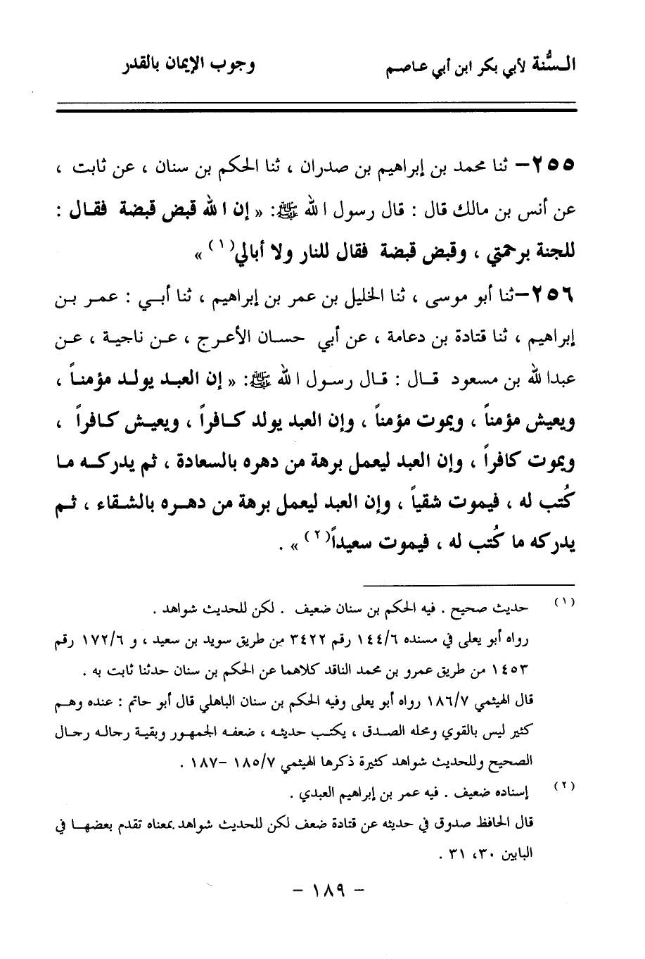 255 - حَدَّثنا مُحَمَّدُ بْنُ إِبْرَاهِيمَ بْنِ صُدْرَانَ، حَدَّثنا الْحَكَمُ بْنُ سِنَانٍ، عَنْ ثَابِتٍ، عَنْ أَنَسِ بْنِ مَالِكٍ قَالَ: قَالَ رَسُولُ اللهِ صَلى الله عَلَيهِ وسَلمَ: إِنَّ اللهَ قَبَضَ قَبْضَةً، فَقَالَ: لِلْجَنَّةِ بِرَحْمَتِي، وَقَبَضَ قَبْضَةً فَقَالَ: لِلنَّارِ، وَلاَ أُبَالِي.
