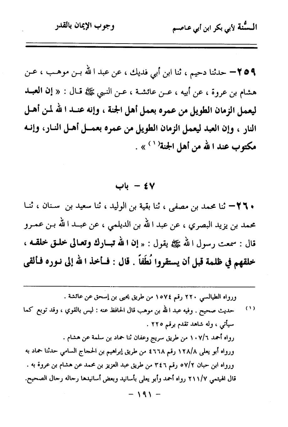 260 - حَدَّثنا مُحَمَّدُ بْنُ مُصَفَّى، حَدَّثنا بَقِيَّةُ بْنُ الْوَلِيدِ، حَدَّثنا سَعِيدُ بْنُ سِنَانٍ، حَدَّثنا مُحَمَّدُ بْنُ يَزِيدَ الْبَصْرِيُّ، عَنْ عَبْدِ اللهِ بْنِ الدَّيْلَمِيِّ، عَنْ عَبْدِ اللهِ بْنِ عَمْرٍو قَالَ: سَمِعْتُ رَسُولَ اللهِ صَلى الله عَلَيهِ وسَلمَ يَقُولُ: إِنَّ اللهَ تَبَارَكَ وَتَعَالَى خَلَقَ خَلْقَهُ، خَلَقَهُمْ فِي ظُلْمَةٍ قَبْلَ أَنْ يَسْتَقِرُّوا نُطَفًا، قَالَ: فَأَخَذَ اللهُ إِلَى نُورِهِ، فَأَلْقَى عَلَيْهِمْ، فَمَنْ شَاءَ أَنْ يُصِيبَهُ مِنْ ذَلِكَ النُّورِ اهْتَدَى، وَمَنْ شَاءَ أَنْ لاَ يُصِيبَهُ ضَلَّ.