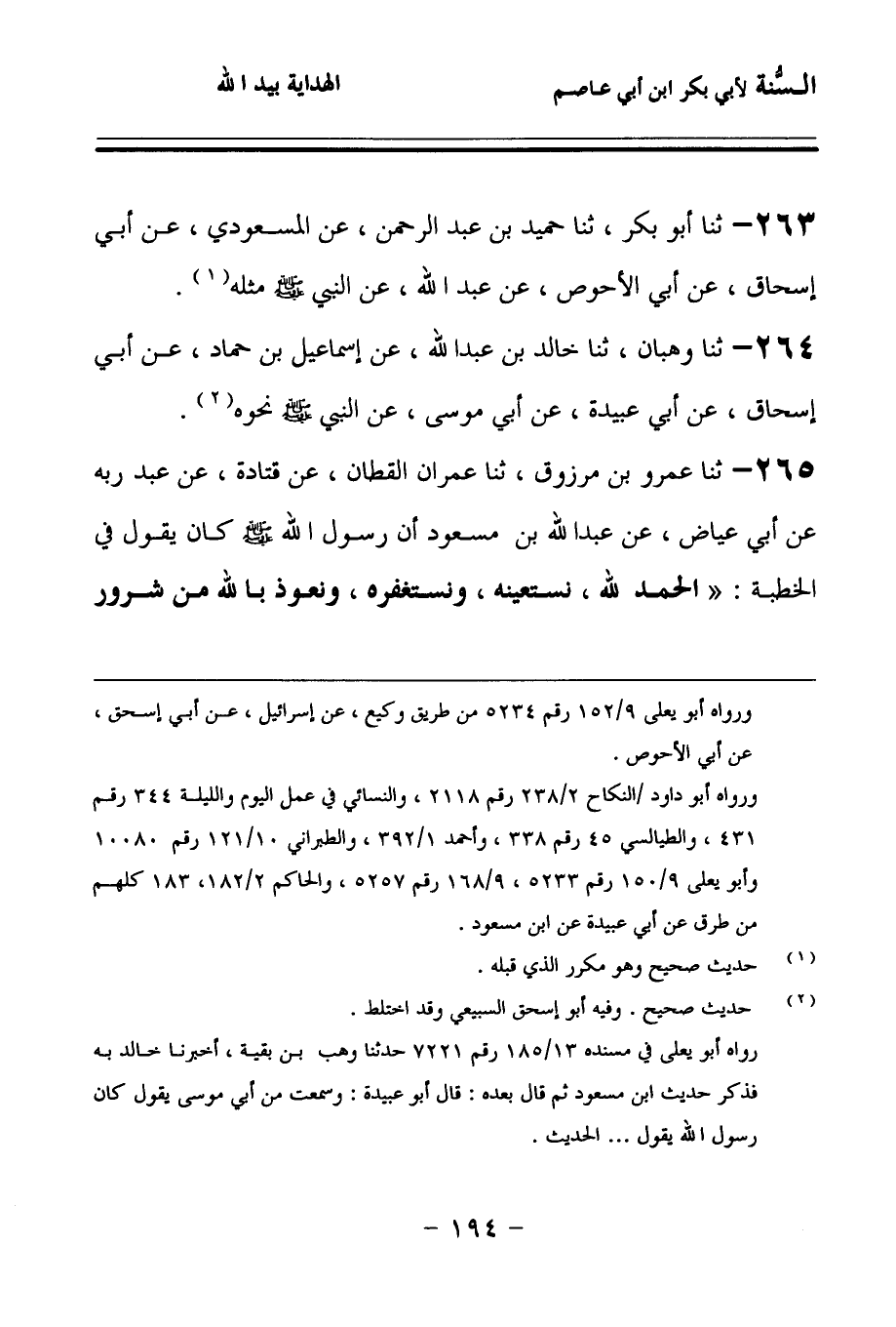 265 - حَدَّثنا عَمْرُو بْنُ مَرْزُوقٍ، حَدَّثنا عِمْرَانُ الْقَطَّانُ، عَنْ قَتَادَةَ، عَنْ عَبْدِ رَبِّهِ، عَنْ أَبِي عِيَاضٍ، عَنْ عَبْدِ اللهِ بْنِ مَسْعُودٍ، أَنَّ رَسُولَ اللهِ صَلى الله عَلَيهِ وسَلمَ كَانَ يَقُولُ فِي الْخُطْبَةِ: الْحَمْدُ لِلَّهِ نَسْتَعِينُهُ، وَنَسْتَغْفِرُهُ، وَنَعُوذُ بِاللهِ مِنْ شُرُورِ أَنْفُسِنَا وَسَيِّئَاتِ أَعْمَالِنَا، مَنْ يَهْدِهِ اللهُ فَلاَ مُضِلَّ لَهُ، وَمَنْ يُضْلِلْ فَلاَ هَادِيَ لَهُ.