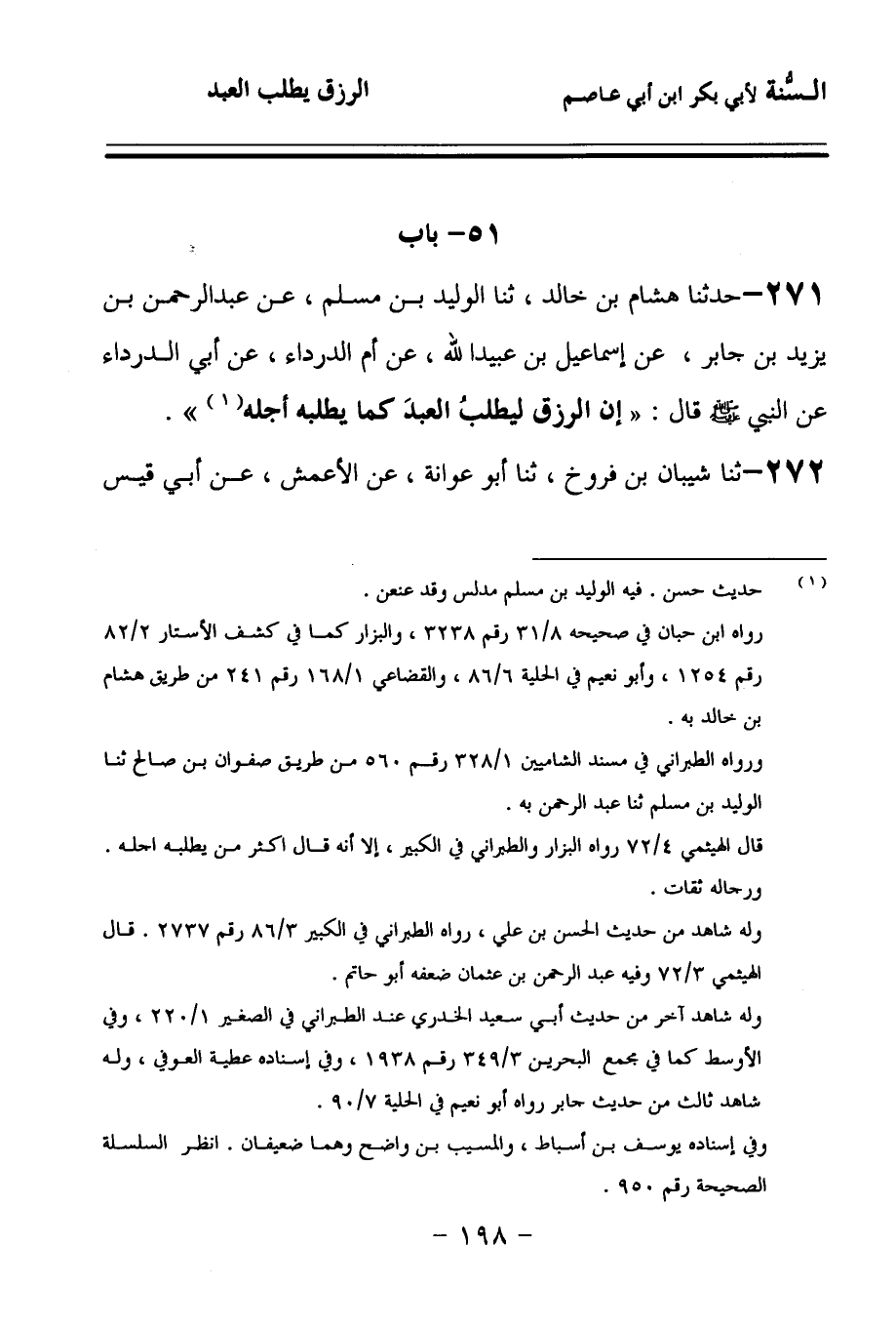 271 - حَدَّثنا هِشَامُ بْنُ خَالِدٍ، حَدَّثنا الْوَلِيدُ بْنُ مُسْلِمٍ، عَنْ عَبْدِ الرَّحْمَنِ بْنِ يَزِيدَ بْنِ جَابِرٍ، عَنْ إِسْمَاعِيلَ بْنِ عُبَيْدِ اللهِ، عَنْ أُمِّ الدَّرْدَاءِ، عَنْ أَبِي الدَّرْدَاءِ، عَنِ النَّبِيِّ صَلى الله عَلَيهِ وسَلمَ قَالَ: إِنَّ الرِّزْقَ لَيَطْلُبُ الْعَبْدَ كَمَا يَطْلُبُهُ أَجَلُهُ.