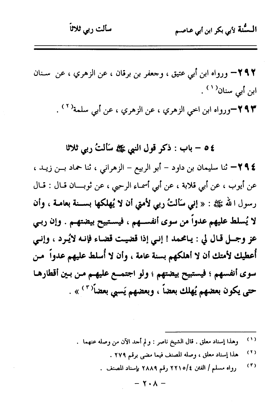 294 - حَدَّثنا سُلَيْمَانُ بْنُ دَاوُدَ, أَبُو الرَّبِيعِ الزَّهْرَانِيُّ، حَدَّثنا حَمَّادُ بْنُ زَيْدٍ، عَنْ أَيُّوبَ، عَنْ أَبِي قِلاَبَةَ، عَنْ أَبِي أَسْمَاءَ الرَّحَبِيِّ، عَنْ ثَوْبَانَ قَالَ: قَالَ رَسُولُ اللهِ صَلى الله عَلَيهِ وسَلمَ: إِنِّي سَأَلْتُ رَبِّي لأُمَّتِي, أَنْ لاَ يُهْلِكَهَا بِسَنَةٍ بِعَامَّةٍ، وَأَنْ لاَ يُسَلِّطَ عَلَيْهِمْ عَدُوًّا مِنْ سِوَى أَنْفُسِهِمْ؛ فَيَسْتَبِيحَ بَيْضَتَهُمْ، وَإِنَّ رَبِّي عَزَّ وَجَلَّ قَالَ لِي: يَا مُحَمَّدُ: إِنِّي إِذَا قَضَيْتُ قَضَاءً, فَإِنَّهُ لاَ يُرَدُّ، وَإِنِّي أُعْطِيكَ لأُمَّتِكَ أَنْ لاَ أُهْلِكَهُمْ بِسَنَةٍ عَامَّةٍ، وَأَنْ لاَ أُسَلِّطَ عَلَيْهِمْ عَدُوًّا مِنْ سِوَى أَنْفُسِهِمْ؛ فَيَسْتَبِيحَ بَيْضَتَهُمْ، وَلَوِ اجْتَمَعَ عَلَيْهِمْ مَنْ بَيْنَ أَقْطَارِهَا، حَتَّى يَكُونَ بَعْضُهُمْ يُهْلِكُ بَعْضًا، وَبَعْضُهُمْ يَسْبِي بَعْضًا.