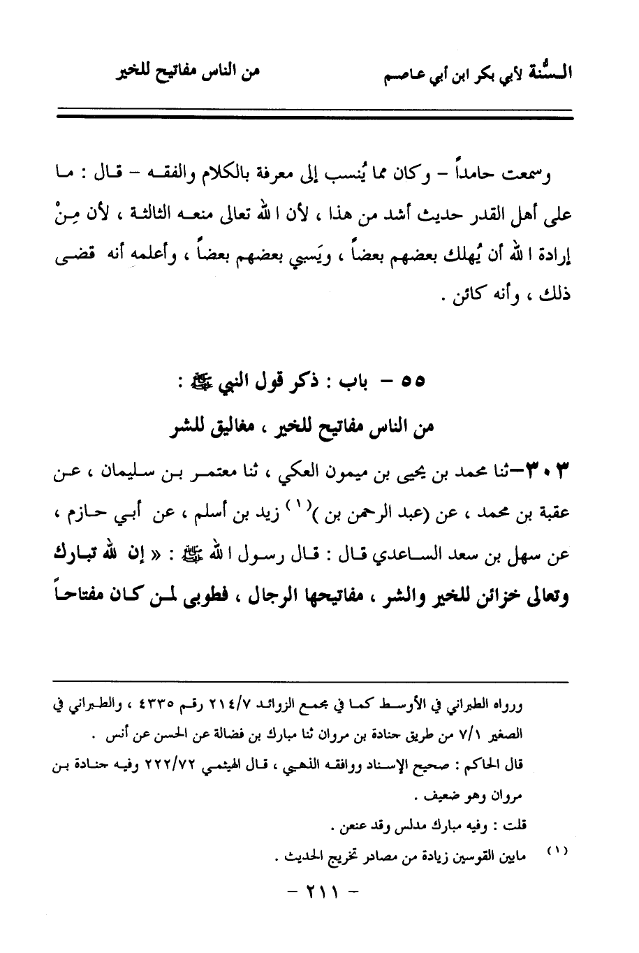 303 - حَدَّثنا مُحَمَّدُ بْنُ يَحْيَى بْنِ مَيْمُونٍ الْعَكِّيُّ، حَدَّثنا مُعْتَمِرُ بْنُ سُلَيْمَانَ، عَنْ عُقْبَةَ بْنِ مُحَمَّدٍ، عَنْ عَبْدِ الرَّحْمَنِ بْنِ زَيْدِ بْنِ أَسْلَمَ، عَنْ أَبِي حَازِمٍ، عَنْ سَهْلِ بْنِ سَعْدٍ السَّاعِدِيِّ قَالَ: قَالَ رَسُولُ اللهِ صَلى الله عَلَيهِ وسَلمَ: إِنَّ لِلَّهِ تَبَارَكَ وَتَعَالَى خَزَائِنَ لِلْخَيْرِ وَالشَّرِّ، مَفَاتِيحُهَا الرِّجَالُ، فَطُوبَى لِمَنْ كَانَ مِفْتَاحًا لِلْخَيْرِ, مِغْلاَقًا لِلشَّرِّ، وَوَيْلاً لِمَنْ جَعَلَهُ مِغْلاَقًا لِلْخَيْرِ, مِفْتَاحًا لِلشَّرِّ.