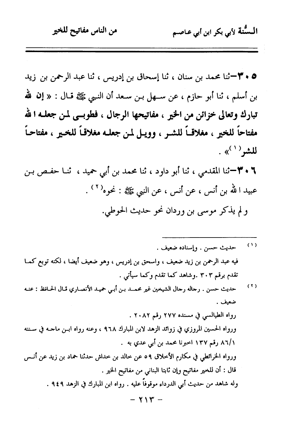 305 - حَدَّثنا مُحَمَّدُ بْنُ سِنَانٍ، حَدَّثنا إِسْحَاقُ بْنُ إِدْرِيسَ، حَدَّثنا عَبْدُ الرَّحْمَنِ بْنُ زَيْدِ بْنِ أَسْلَمَ، حَدَّثنا أَبُو حَازِمٍ، عَنْ سَهْلِ بْنِ سَعْدٍ، أَنَّ النَّبِيَّ صَلى الله عَلَيهِ وسَلمَ قَالَ: إِنَّ لِلَّهِ تَبَارَكَ وَتَعَالَى خَزَائِنَ مِنَ الْخَيْرِ، مَفَاتِيحُهَا الرِّجَالُ، فَطُوبَى لِمَنْ جَعَلَهُ اللهُ مِفْتَاحًا لِلْخَيْرِ, مِغْلاَقًا لِلشَّرِّ، وَوَيْلٌ لِمَنْ جَعَلَهُ مِغْلاَقًا لِلْخَيْرِ, مِفْتَاحًا لِلشَّرِّ.