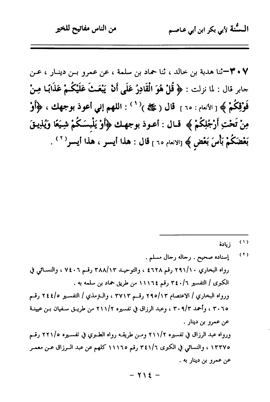 307 - حَدَّثنا هُدْبَةُ بْنُ خَالِدٍ، حَدَّثنا حَمَّادُ بْنُ سَلَمَةَ، عَنْ عَمْرِو بْنِ دِينَارٍ، عَنْ جَابِرٍ، قَالَ: لَمَّا نَزَلَتْ: {قُلْ هُوَ الْقَادِرُ عَلَى أَنْ يَبْعَثَ عَلَيْكُمْ عَذَابًا مِنْ فَوْقِكُمْ} قَالَ صَلى الله عَلَيهِ وسَلمَ: اللهُمَّ إِنِّي أَعُوذُ بِوَجْهِكَ: {أَوْ مِنْ تَحْتِ أَرْجُلِكُمْ} قَالَ: أَعُوذُ بِوَجْهِكَ، {أَوْ يَلْبِسَكُمْ شِيَعًا وَيُذِيقَ بَعْضَكُمْ بَأْسَ بَعْضٍ} قَالَ: هَذَا أَيْسَرُ، هَذَا أَيْسَرُ.