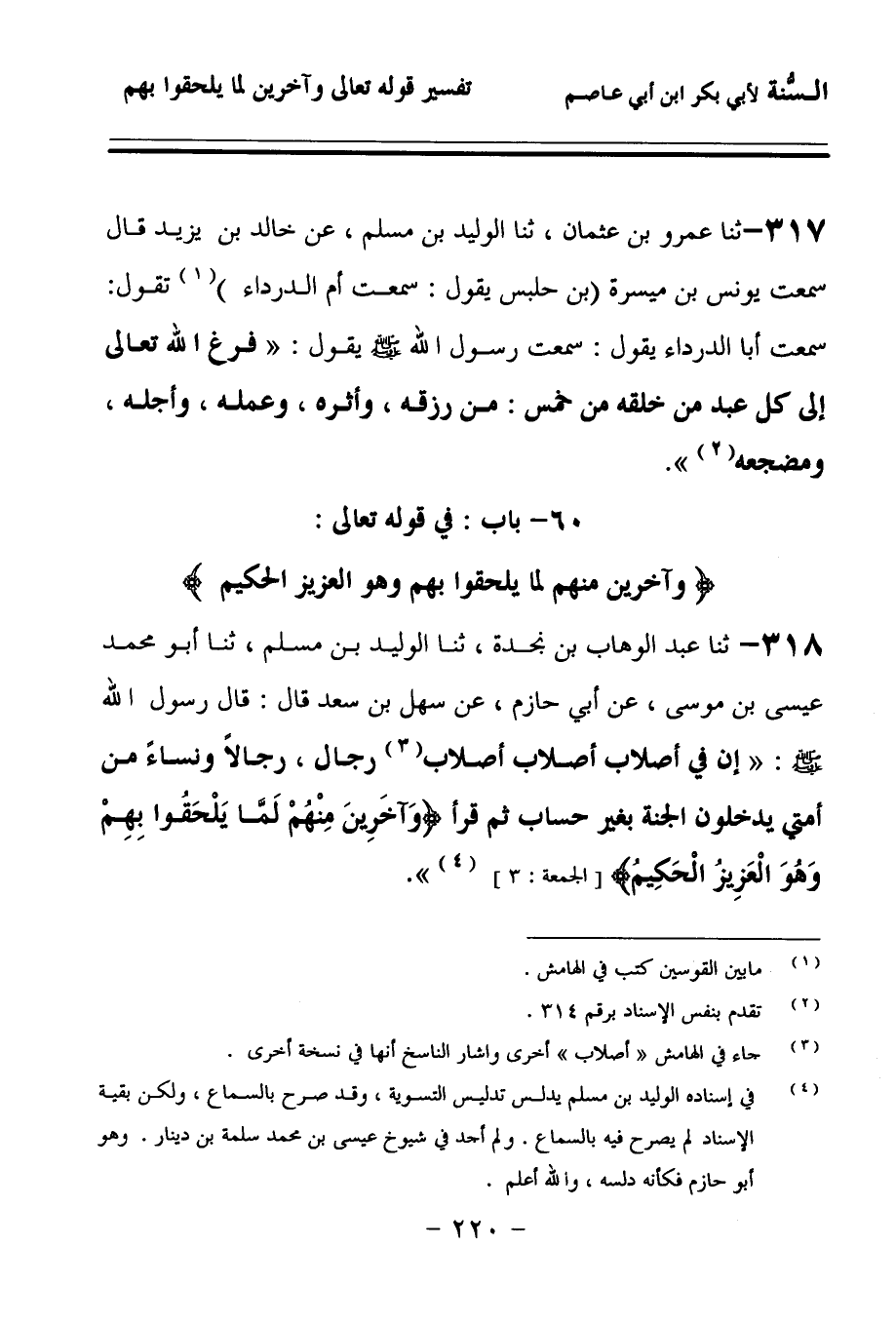 318 - حَدَّثنا عَبْدُ الْوَهَّابِ بْنُ نَجْدَةَ، حَدَّثنا الْوَلِيدُ بْنُ مُسْلِمٍ، حَدَّثنا أَبُو مُحَمَّدٍ عِيسَى بْنُ مُوسَى، عَنْ أَبِي حَازِمٍ، عَنْ سَهْلِ بْنِ سَعْدٍ قَالَ: قَالَ رَسُولُ اللهِ صَلى الله عَلَيهِ وسَلمَ: إِنَّ فِي أَصْلاَبِ أَصْلاَبِ أَصْلاَبِ رِجَالٍ, رِجَالاً وَنِسَاءً مِنْ أُمَّتِي يَدْخُلُونَ الْجَنَّةَ بِغَيْرِ حِسَابٍ, ثُمَّ قَرَأَ: {وَآخَرِينَ مِنْهُمْ لَمَّا يَلْحَقُوا بِهِمْ وَهُوَ الْعَزِيزُ الْحَكِيمُ}.