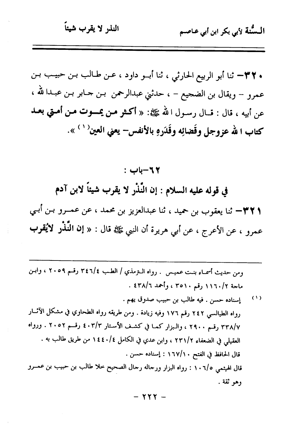 320 - حَدَّثنا أَبُو الرَّبِيعِ الْحَارِثِيُّ، حَدَّثنا أَبُو دَاوُدَ، عَنْ طَالِبِ بْنِ حَبِيبِ بْنِ عَمْرُو، وَيُقَالُ: ابْنُ الضَّجِيعِ، حَدَّثَنِي عَبْدُ الرَّحْمَنِ بْنُ جَابِرِ بْنِ عَبْدِ اللهِ، عَنْ أَبِيهِ، قَالَ: قَالَ رَسُولُ اللهِ صَلى الله عَلَيهِ وسَلمَ: أَكْثَرُ مَنْ يَمُوتُ مِنْ أُمَّتِي بَعْدَ كِتَابِ اللهِ عَزَّ وَجَلَّ وَقَضَائِهِ وَقَدَرِهِ بِالأَنْفُسِ، يَعْنِي الْعَيْنَ.