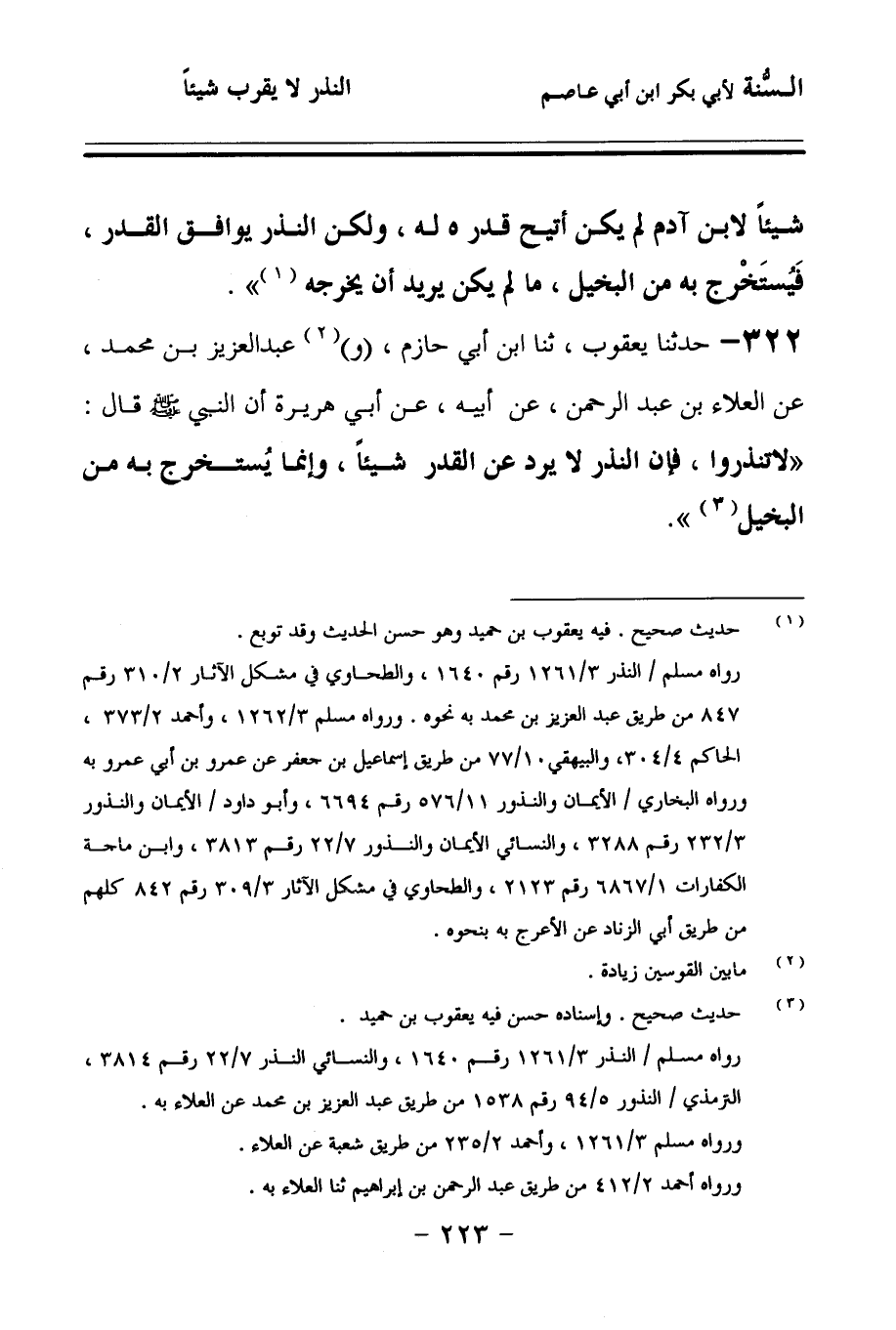 322 - حَدَّثنا يَعْقُوبُ، حَدَّثنا ابْنُ أَبِي حَازِمٍ (و) عَبْدُ الْعَزِيزِ بْنُ مُحَمَّدٍ، عَنِ الْعَلاَءِ بْنِ عَبْدِ الرَّحْمَنِ، عَنْ أَبِيهِ، عَنْ أَبِي هُرَيْرَةَ، أَنَّ النَّبِيَّ صَلى الله عَلَيهِ وسَلمَ قَالَ: لاَ تَنْذِرُوا؛ فَإِنَّ النَّذْرَ لاَ يَرُدُّ عَنِ الْقَدَرِ شَيْئًا، وَإِنَّمَا يُسْتَخْرَجُ بِهِ مِنَ الْبَخِيلِ.
