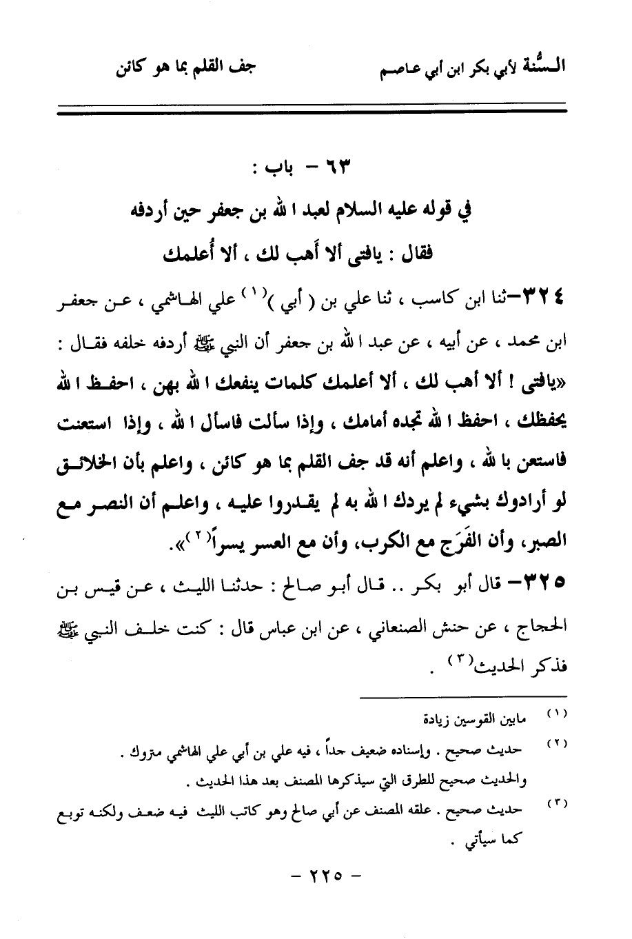 324 - حَدَّثنا ابْنُ كَاسِبٍ، حَدَّثنا عَلِيُّ بْنُ (أَبِي) عَلِيٍّ الْهَاشِمِيُّ، عَنْ جَعْفَرِ بْنِ مُحَمَّدٍ، عَنْ أَبِيهِ، عَنْ عَبْدِ اللهِ بْنِ جَعْفَرٍ، أَنَّ النَّبِيَّ صَلى الله عَلَيهِ وسَلمَ أَرْدَفَهُ خَلْفَهُ فَقَالَ: يَا فَتَى, أَلاَ أَهَبُ لَكَ، أَلاَ أُعَلِّمُكَ كَلِمَاتٍ يَنْفَعُكَ اللهُ بِهِنَّ: احْفَظِ اللهَ يَحْفَظْكَ، احْفَظِ اللهَ تَجِدْهُ أَمَامَكَ، وَإِذَا سَأَلْتَ فَاسْأَلِ اللهَ، وَإِذَا اسْتَعَنْتَ فَاسْتَعِنْ بِاللهِ، وَاعْلَمْ أَنَّهُ قَدْ جَفَّ الْقَلَمُ بِمَا هُوَ كَائِنٌ، وَاعْلَمْ بِأَنَّ الْخَلاَئِقَ لَوْ أَرَادُوكَ بِشَيْءٍ لَمْ يُرِدْكَ اللهُ بِهِ لَمْ يَقْدِرُوا عَلَيْهِ، وَاعْلَمْ أَنَّ النَّصْرَ مَعَ الصَّبْرِ، وَأَنَّ الْفَرَجَ مَعَ الْكَرْبِ، وَأَنَّ مَعَ الْعُسْرِ يُسْرًا.