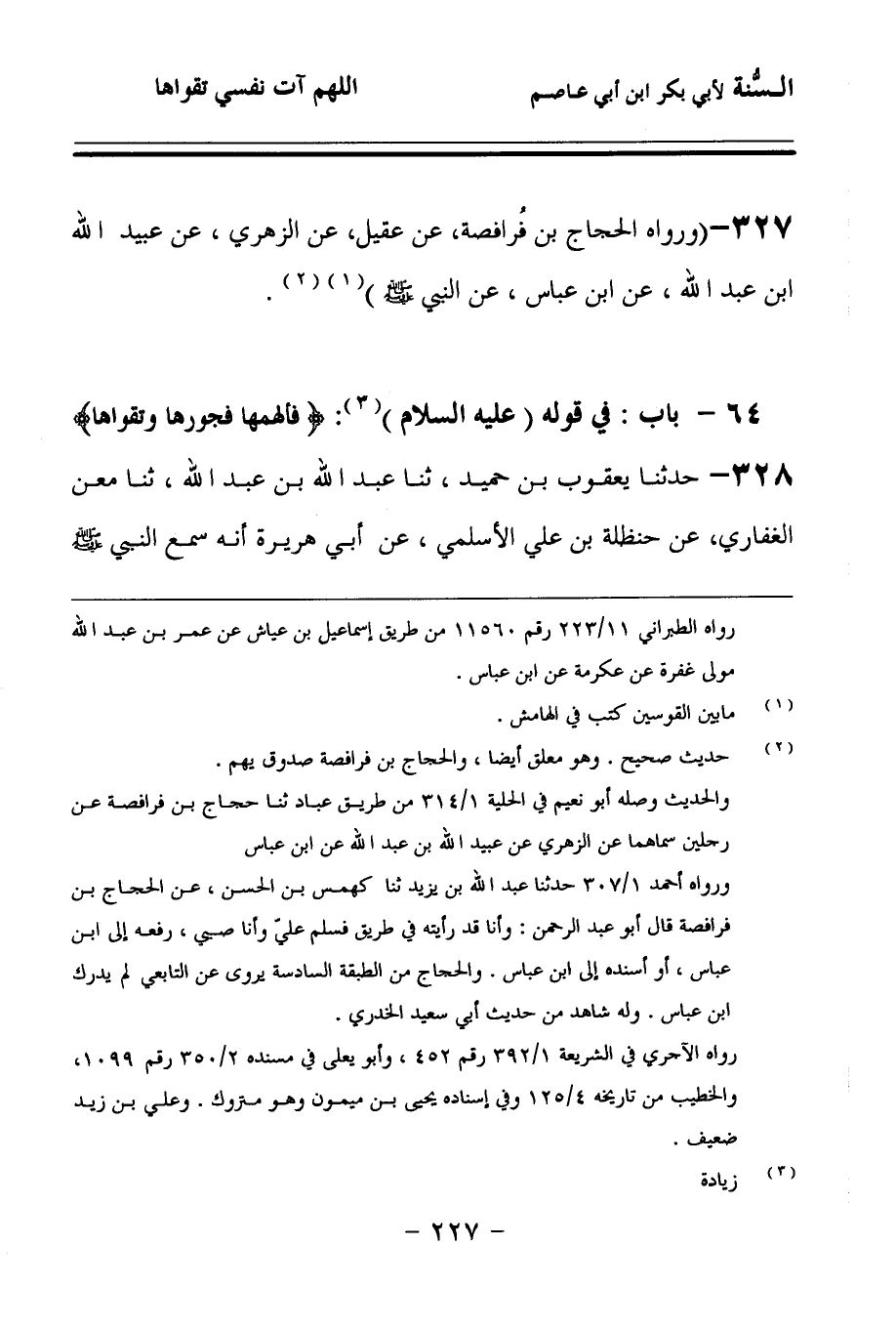 328 - حَدَّثنا يَعْقُوبُ بْنُ حُمَيْدٍ، حَدَّثنا عَبْدُ اللهِ بْنُ عَبْدِ اللهِ، حَدَّثنا مَعْنٌ الْغِفَارِيُّ، عَنْ حَنْظَلَةَ بْنِ عَلِيٍّ الأَسْلَمِيِّ، عَنْ أَبِي هُرَيْرَةَ، أَنَّهُ سَمِعَ النَّبِيَّ صَلى الله عَلَيهِ وسَلمَ يَقُولُ: {فَأَلْهَمَهَا فُجُورَهَا وَتَقْوَاهَا} قَالَ: اللهُمَّ آتِ نَفْسِي تَقْوَاهَا، زَكِّهَا أَنْتَ خَيْرُ مَنْ زَكَّاهَا، أَنْتَ وَلِيُّهَا وَمَوْلاَهَا.
