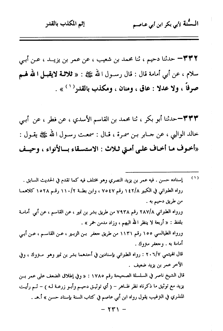 332 - حَدَّثنا دُحَيْمٌ، حَدَّثنا مُحَمَّدُ بْنُ شُعَيْبٍ، عَنْ عُمَرَ بْنِ يَزِيدَ، عَنْ أَبِي سَلاَمٍ، عَنْ أَبِي أُمَامَةَ، قَالَ: قَالَ رَسُولُ اللهِ صَلى الله عَلَيهِ وسَلمَ: ثَلاَثَةٌ لاَ يَقْبَلُ اللهُ لَهُمْ صَرْفًا وَلاَ عَدْلاً: عَاقٌّ، وَمَنَّانٌ، وَمُكَذِّبٌ بِالْقَدَرِ.