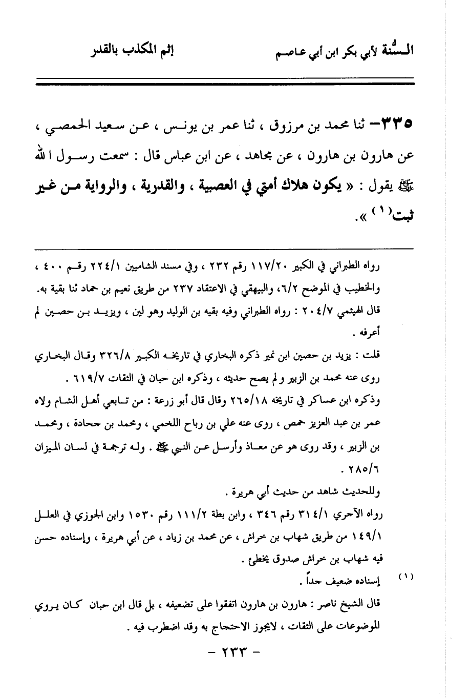 335 - حَدَّثنا مُحَمَّدُ بْنُ مَرْزُوقٍ، حَدَّثنا عُمَرُ بْنُ يُونُسَ، عَنْ سَعِيدٍ الْحِمْصِيِّ، عَنْ هَارُونَ بْنِ هَارُونَ، عَنْ مُجَاهِدٍ، عَنِ ابْنِ عَبَّاسٍ، قَالَ: سَمِعْتُ رَسُولَ اللهِ صَلى الله عَلَيهِ وسَلمَ يَقُولُ: يكون هَلاَكُ أُمَّتِي فِي الْعَصَبِيَّةِ، وَالْقَدَرِيَّةِ، وَالرِّوَايَةِ مِنْ غَيْرِ ثَبْتٍ.