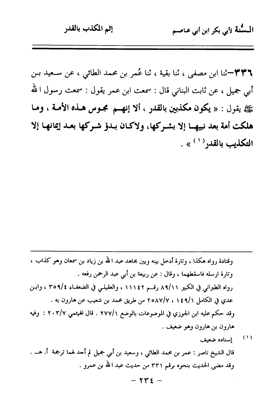 336 - حَدَّثنا ابْنُ مُصَفَّى، حَدَّثنا بَقِيَّةُ، حَدَّثنا عُمَرُ بْنُ مُحَمَّدٍ الطَّائِيُّ، عَنْ سَعِيدِ بْنِ أَبِي جَمِيلٍ، عَنْ ثَابِتٍ الْبُنَانِيِّ، قَالَ: سَمِعْتُ ابْنَ عُمَرَ يَقُولُ: سَمِعْتُ رَسُولَ اللهِ صَلى الله عَلَيهِ وسَلمَ يَقُولُ: يَكُونُ مُكَذِّبِينَ بِالْقَدَرِ، أَلاَ إِنَّهُمْ مَجُوسُ هَذِهِ الأُمَّةِ، وَمَا هَلَكَتْ أُمَّةٌ بَعْدَ نَبِيِّهَا إِلاَّ بِشِرْكِهَا، وَلاَ كَانَ بَدْءَ شِرْكِهَا بَعْدَ إِيمَانِهَا إِلاَّ التَّكْذِيبُ بِالْقَدَرِ.