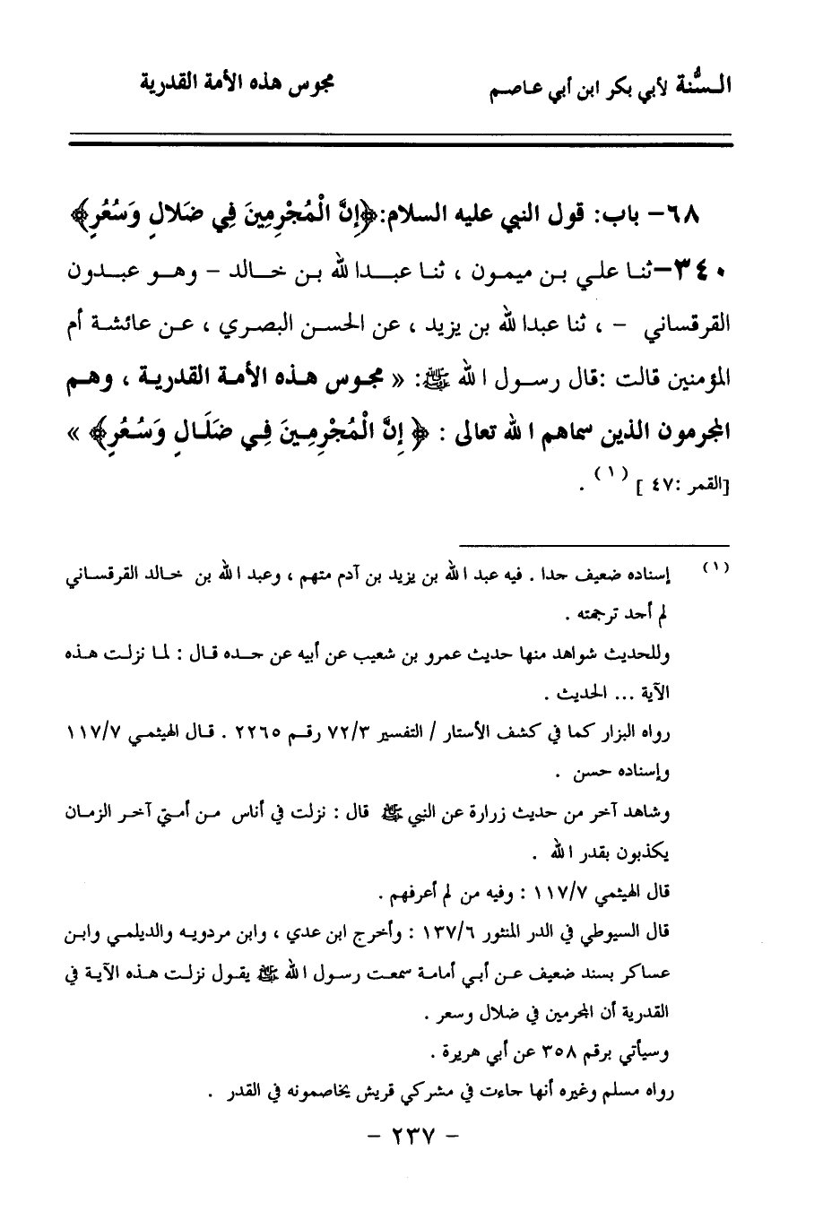340 - حَدَّثنا عَلِيُّ بْنُ مَيْمُونٍ، حَدَّثنا عَبْدُ اللهِ بْنُ خَالِدٍ، وَهُوَ عَبْدُونُ الْقَرْقَسَانِيُّ، حَدَّثنا عَبْدُ اللهِ بْنُ يَزِيدَ، عَنِ الْحَسَنِ الْبَصْرِيِّ، عَنْ عَائِشَةَ أُمِّ الْمُؤْمِنِينَ، قَالَتْ: قَالَ رَسُولُ اللهِ صَلى الله عَلَيهِ وسَلمَ: مَجُوسُ هَذِهِ الأُمَّةِ الْقَدَرِيَّةُ، وَهُمُ الْمُجْرِمُونَ الَّذِينَ سَمَّاهُمُ اللهُ تَعَالَى: {إِنَّ الْمُجْرِمِينَ فِي ضَلاَلٍ وَسُعُرٍ}.