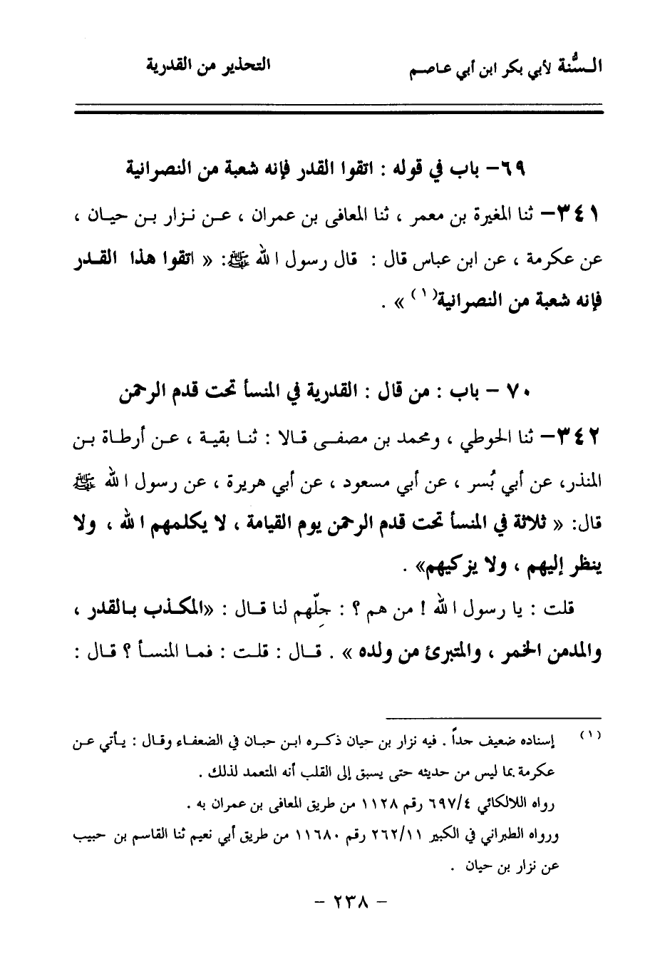 341 - حَدَّثنا الْمُغِيرَةُ بْنُ مَعْمَرٍ، حَدَّثنا الْمُعَافَى بْنُ عِمْرَانَ، عَنْ نِزَارِ بْنِ حَيَّانَ، عَنْ عِكْرِمَةَ، عَنِ ابْنِ عَبَّاسٍ، قَالَ: قَالَ رَسُولُ اللهِ صَلى الله عَلَيهِ وسَلمَ: اتَّقُوا هَذَا الْقَدَرَ؛ فَإِنَّهُ شُعْبَةٌ مِنَ النَّصْرَانِيَّةِ.