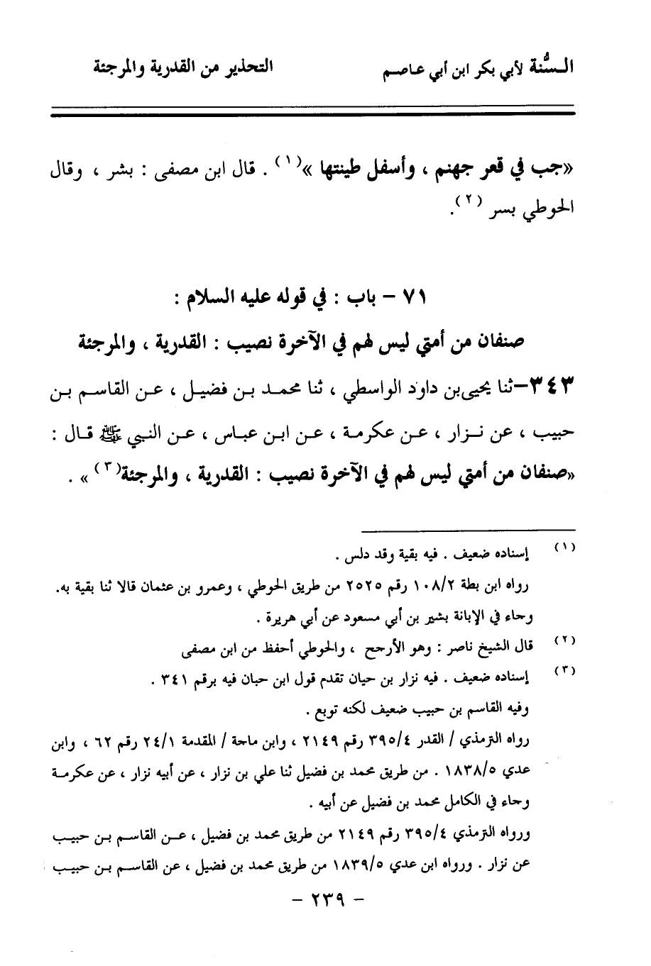 343 - حَدَّثنا يَحْيَى بْنُ دَاوُدَ الْوَاسِطِيُّ، حَدَّثنا مُحَمَّدُ بْنُ فُضَيْلٍ، عَنِ الْقَاسِمِ بْنِ حَبِيبٍ، عَنْ نِزَارٍ، عَنْ عِكْرِمَةَ، عَنِ ابْنِ عَبَّاسٍ، عَنِ النَّبِيِّ صَلى الله عَلَيهِ وسَلمَ قَالَ: صِنْفَانِ مِنْ أُمَّتِي لَيْسَ لَهُمْ فِي الآخِرَةِ نَصِيبٌ: الْقَدَرِيَّةُ، وَالْمُرْجِئَةُ.