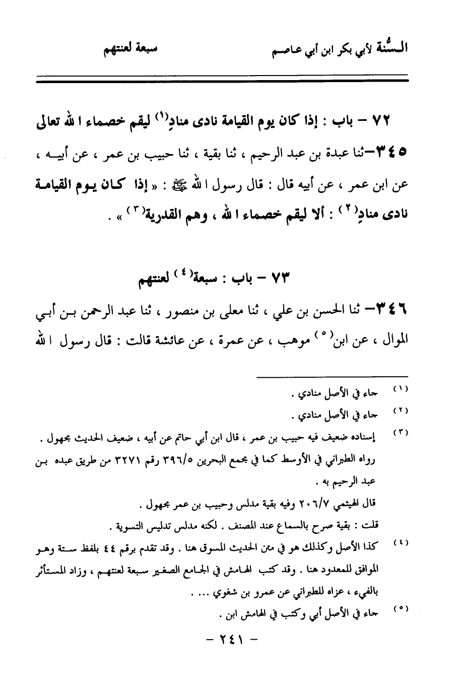 345 - حَدَّثنا عَبْدَةُ بْنُ عَبْدِ الرَّحِيمِ، حَدَّثنا بَقِيَّةُ، حَدَّثنا حَبِيبُ بْنُ عُمَرَ، عَنْ أَبِيهِ، عَنِ ابْنِ عُمَرَ، عَنْ أَبِيهِ، قَالَ: قَالَ رَسُولُ اللهِ صَلى الله عَلَيهِ وسَلمَ: إِذَا كَانَ يَوْمُ الْقِيَامَةِ نَادَى مُنَادٍ: أَلاَ لِيَقُمْ خُصَمَاءُ اللهِ، وَهُمُ الْقَدَرِيَّةُ.