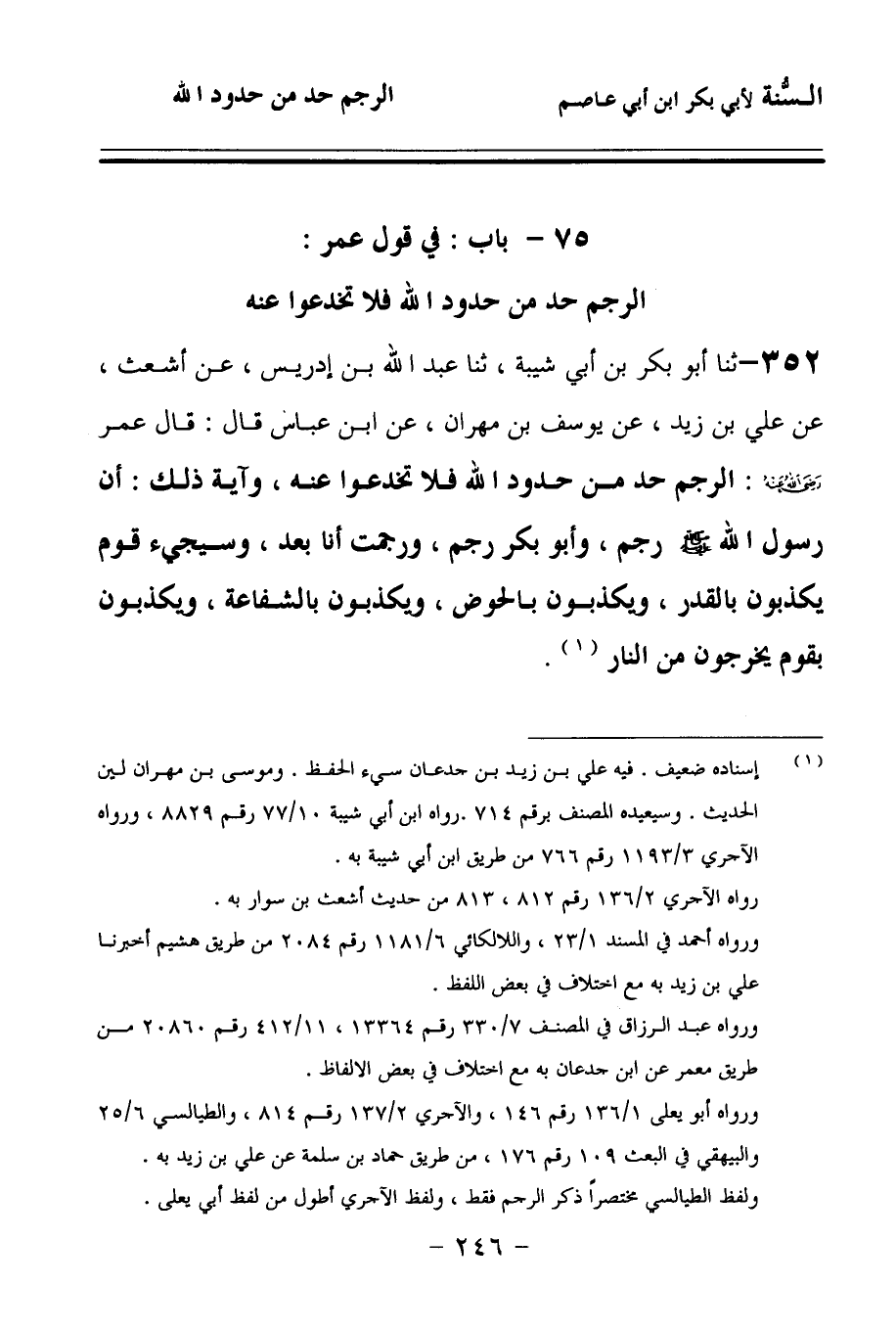 352 - حَدَّثنا أَبُو بَكْرِ بْنُ أَبِي شَيْبَةَ، حَدَّثنا عَبْدُ اللهِ بْنُ إِدْرِيسَ، عَنْ أَشْعَثَ، عَنْ عَلِيِّ بْنِ زَيْدٍ، عَنْ يُوسُفَ بْنِ مِهْرَانَ، عَنِ ابْنِ عَبَّاسٍ، قَالَ: قَالَ عُمَرُ، رَضِيَ اللهُ عَنْهُ: الرَّجْمُ حَدٌّ مِنْ حُدُودِ اللهِ؛ فَلاَ تُخْدَعُوا عَنْهُ، وَآيَةُ ذَلِكَ أَنَّ رَسُولَ اللهِ صَلى الله عَلَيهِ وسَلمَ رَجَمَ، وَأَبُو بَكْرٍ رَجَمَ، وَرَجَمْتُ أَنَا بَعْدُ، وَسَيَجِيءُ قَوْمٌ يُكَذِّبُونَ بِالْقَدَرِ، وَيُكَذِّبُونَ بِالْحَوْضِ، وَيُكَذِّبُونَ بِالشَّفَاعَةِ، وَيُكَذِّبُونَ بِقَوْمٍ يَخْرُجُونَ مِنَ النَّارِ.