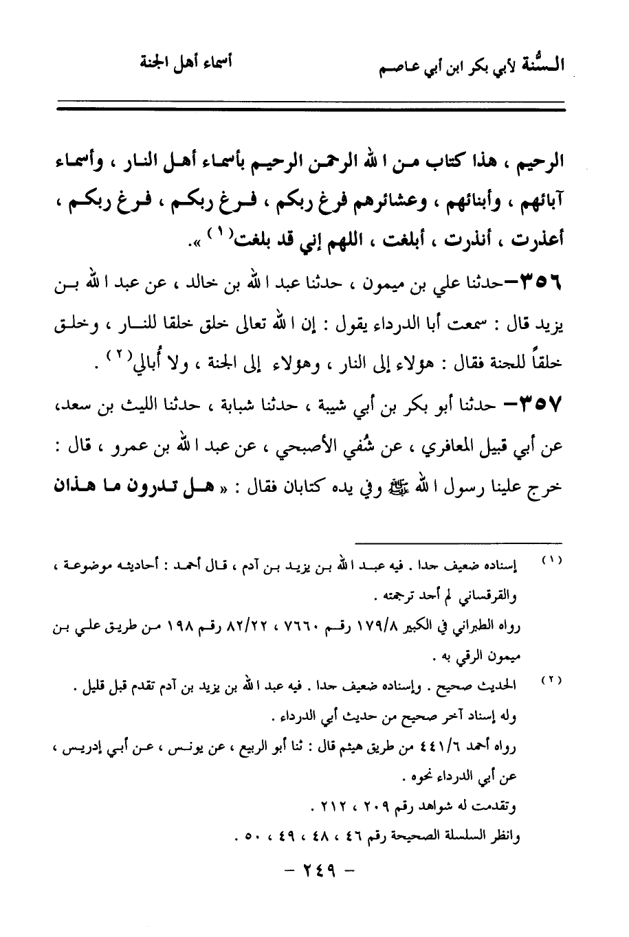 357 - حَدَّثنا أَبُو بَكْرِ بْنُ أَبِي شَيْبَةَ، حَدَّثنا شَبَابَةُ، حَدَّثنا اللَّيْثُ بْنُ سَعْدٍ، عَنْ أَبِي قَبِيلٍ الْمَعَافِرِيِّ، عَنْ شُفَيٍّ الأَصْبَحِيِّ، عَنْ عَبْدِ اللهِ بْنِ عَمْرٍو، قَالَ: خَرَجَ عَلَيْنَا رَسُولُ اللهِ صَلى الله عَلَيهِ وسَلمَ، وَفِي يَدِهِ كِتَابَانِ، فَقَالَ: هَلْ تَدْرُونَ مَا هَذَانِ الْكِتَابَانِ؟ قُلْنَا: لاَ، إِلاَّ أَنْ تُخْبِرَنَا، فَقَالَ لِلَّذِي فِي يَمِينِهِ: هَذَا كِتَابٌ مِنْ رَبِّ الْعَالَمِينَ, فِيهِ أَسْمَاءِ أَهْلِ الْجَنَّةِ وَأَسْمَاءِ آبَائِهِمْ وَقَبَائِلِهِمْ، ثُمَّ أَجْمَلَ عَلَى آخِرِهِمْ، فَلاَ يَزْدَادُ فِيهِمْ وَلاَ يَنْقُصُ أَبَدًا، وَقَالَ لِلَّذِي فِي يَسَارِهِ: هَذَا كِتَابٌ مِنْ رَبِّ الْعَالَمِينَ, فِيهِ أَسْمَاءُ أَهْلِ النَّارِ وَأَسْمَاءُ آبَائِهِمْ وَقَبَائِلِهِمْ، ثُمَّ أَجْمَلَ عَلَى آخِرِهِمْ، فَلاَ يَزْدَادُ فِيهِمْ وَلاَ يَنْقُصُ، فَقَالَ أَصْحَابُ رَسُولِ اللهِ صَلى الله عَلَيهِ وسَلمَ: فَفِي أَيِّ شَيْءٍ نَعْمَلُ وَقَدْ فُرِغَ مِنَ الأَمْرِ؟ فَقَالَ رَسُولُ اللهِ صَلى الله عَلَيهِ وسَلمَ: سَدِّدُوا، وَقَارِبُوا، فَإِنَّ صَاحِبَ الْجَنَّةِ مَخْتُومٌ لَهُ بِعَمَلِ أَهْلِ الْجَنَّةِ، وَإِنْ عَمِلَ أَيَّ عَمَلٍ، وَإِنَّ صَاحِبَ النَّارِ مَخْتُومٌ لَهُ بِعَمَلِ أَهْلِ النَّارِ، وَإِنْ عَمِلَ أَيَّ عَمَلٍ، ثُمَّ قَالَ بِيَدِهِ فَجَمَعَهَا، فَقَالَ: فَرَغَ رَبُّكُمْ مِنَ الْعَمَلِ: {فَرِيقٌ فِي الْجَنَّةِ وَفَرِيقٌ فِي السَّعِيرِ}.