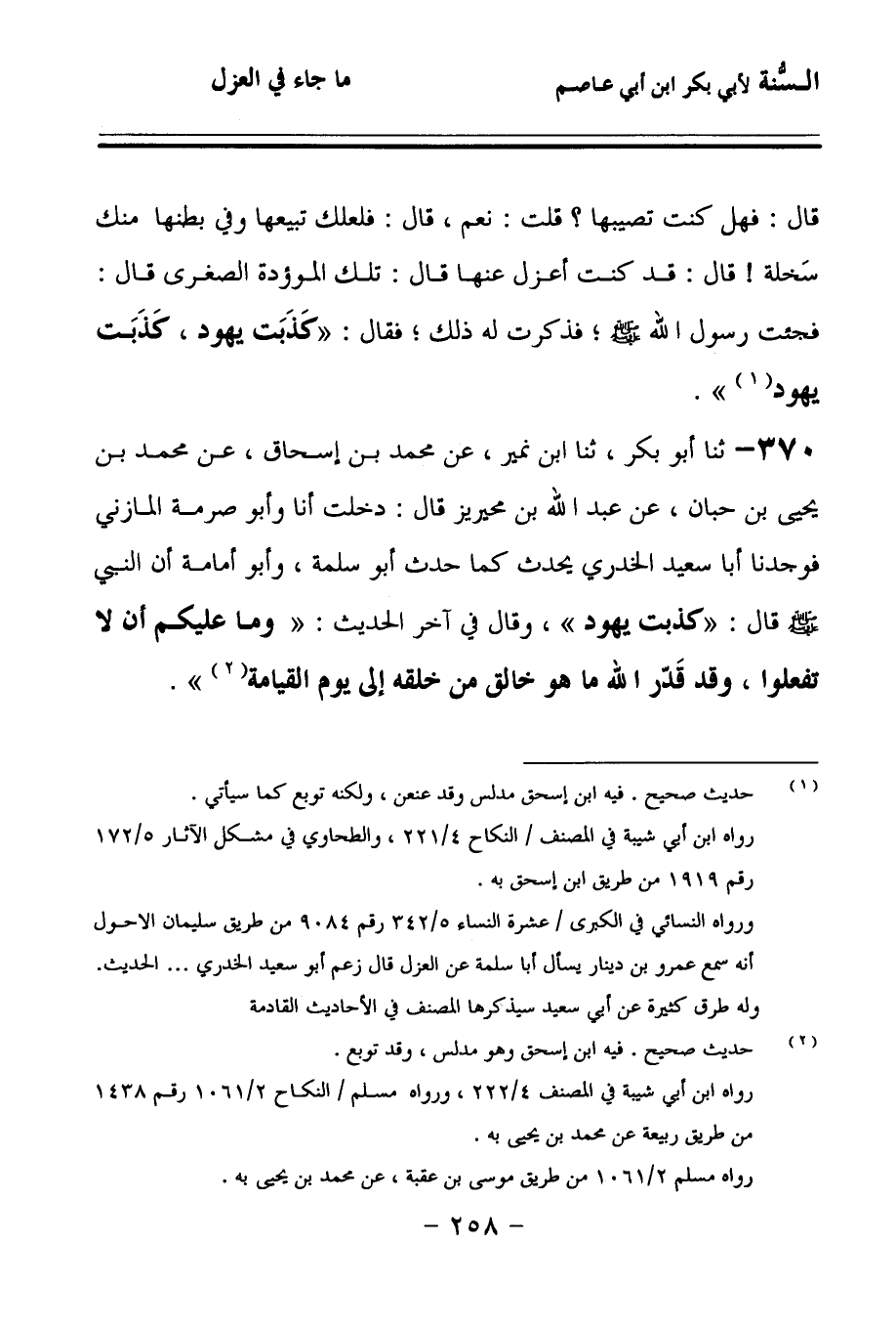 370 - حَدَّثنا أَبُو بَكْرٍ، حَدَّثنا ابْنُ نُمَيْرٍ، عَنْ مُحَمَّدِ بْنِ إِسْحَاقَ، عَنْ مُحَمَّدِ بْنِ يَحْيَى بْنِ حَبَّانَ، عَنْ عَبْدِ اللهِ بْنِ مُحَيْرِيزٍ، قَالَ: دَخَلْتُ أَنَا وَأَبُو صِرْمَةَ الْمَازِنِيُّ، فَوَجَدْنَا أَبَا سَعِيدٍ الْخُدْرِيَّ يُحَدِّثُ كَمَا حَدَّثَ أَبُو سَلَمَةَ، وَأَبُو أُمَامَةَ، أَنَّ النَّبِيَّ صَلى الله عَلَيهِ وسَلمَ قَالَ: كَذَبَتْ يَهُودُ، وَقَالَ فِي آخِرِ الْحَدِيثِ: وَمَا عَلَيْكُمْ أَلاَّ تَفْعَلُوا، وَقَدْ قَدَّرَ اللهُ مَا هُوَ خَالِقٌ مِنْ خَلْقِهِ إِلَى يَوْمِ الْقِيَامَةِ.