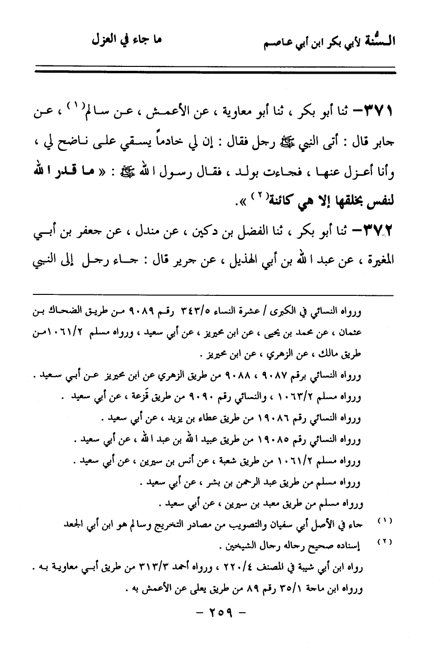 371 - حَدَّثنا أَبُو بَكْرٍ، حَدَّثنا أَبُو مُعَاوِيَةَ، عَنِ الأَعْمَشِ، عَنْ سَالِمٍ، عَنْ جَابِرٍ، قَالَ: أَتَى النَّبِيَّ صَلى الله عَلَيهِ وسَلمَ رَجُلٌ, فَقَالَ: إِنَّ لِي خَادِمًا يَسْقِي عَلَى نَاضِحٍ لِي، وَأَنَا أَعْزِلُ عَنْهَا، فَجَاءَتْ بِوَلَدٍ، فَقَالَ رَسُولُ اللهِ صَلى الله عَلَيهِ وسَلمَ: مَا قَدَّرَ اللهُ لِنَفْسٍ بِخَلْقِهَا إِلاَّ هِيَ كَائِنَةٌ.