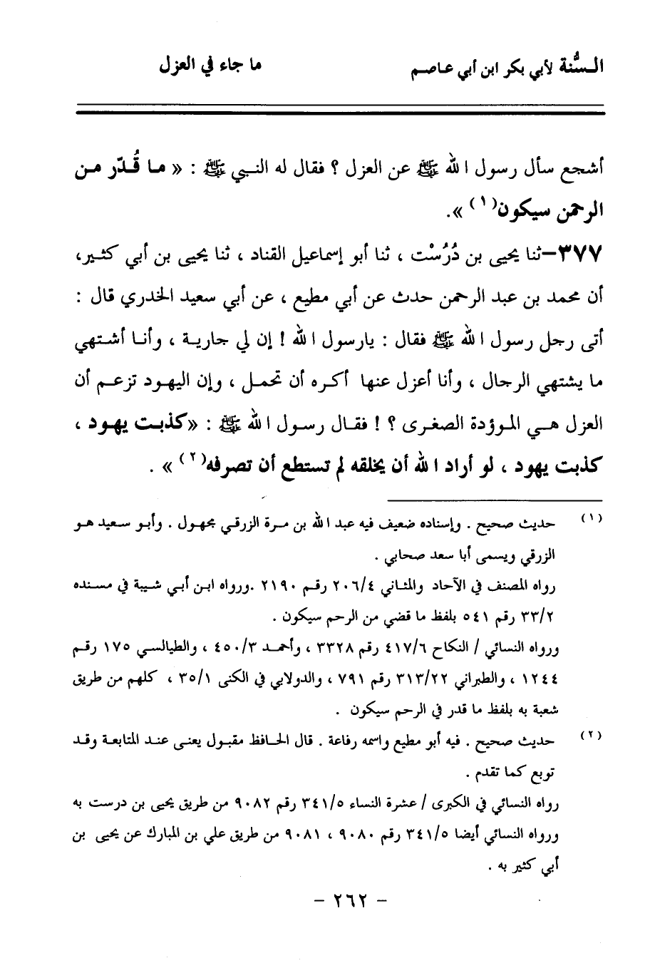377 - حَدَّثنا يَحْيَى بْنُ دُرُسْتَ، حَدَّثنا أَبُو إِسْمَاعِيلَ الْقَنَّادُ، حَدَّثنا يَحْيَى بْنُ أَبِي كَثِيرٍ، أَنَّ مُحَمَّدَ بْنَ عَبْدِ الرَّحْمَنِ، حَدَّثَ عَنْ أَبِي مُطِيعٍ، عَنْ أَبِي سَعِيدٍ الْخُدْرِيِّ، قَالَ: أَتَى رَجُلٌ رَسُولَ اللهِ صَلى الله عَلَيهِ وسَلمَ فَقَالَ: يَا رَسُولَ اللهِ, إِنَّ لِي جَارِيَةً وَأَنَا أَشْتَهِي مَا يَشْتَهِي الرِّجَالُ، وَأَنَا أَعْزِلُ عَنْهَا, أَكْرَهُ أَنْ تَحْمِلَ، وَإِنَّ الْيَهُودَ تَزْعُمُ أَنَّ الْعَزْلَ هِيَ الْمَوْؤُودَةُ الصُّغْرَى، فَقَالَ رَسُولُ اللهِ صَلى الله عَلَيهِ وسَلمَ: كَذَبَتْ يَهُودُ، كَذَبَتْ يَهُودُ، لَوْ أَرَادَ اللهُ أَنْ يَخْلُقَهُ لَمْ تَسْتَطِعْ أَنْ تَصْرِفَهُ.