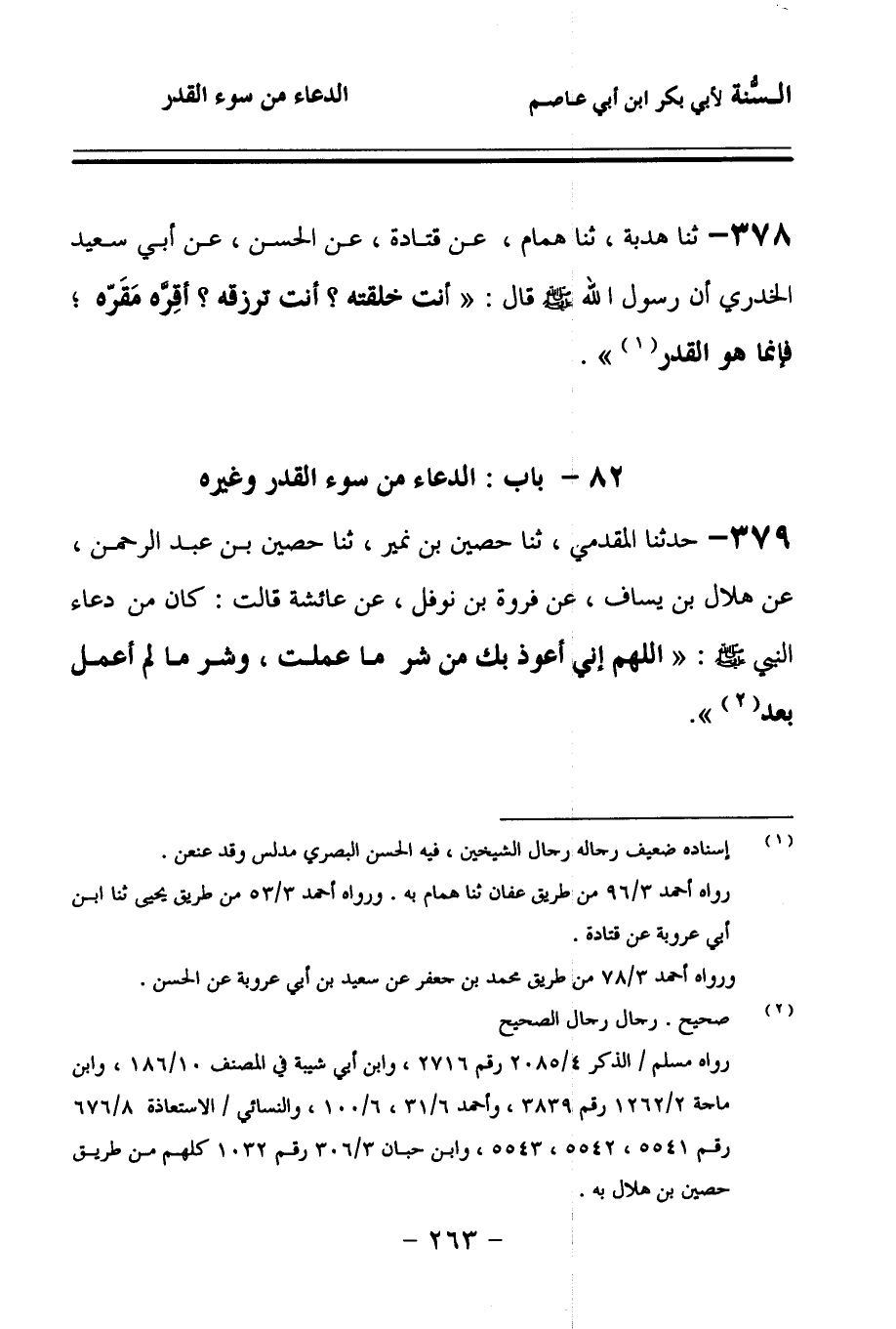 378 - حَدَّثنا هُدْبَةُ، حَدَّثنا هَمَّامٌ، عَنْ قَتَادَةَ، عَنِ الْحَسَنِ، عَنْ أَبِي سَعِيدٍ الْخُدْرِيِّ، أَنَّ رَسُولَ اللهِ صَلى الله عَلَيهِ وسَلمَ قَالَ: أَنْتَ خَلَقْتَهُ، أَنْتَ تَرْزُقُهُ، أَقِرَّهُ مَقَرَّهُ، فَإِنَّمَا هُوَ الْقَدَرُ.