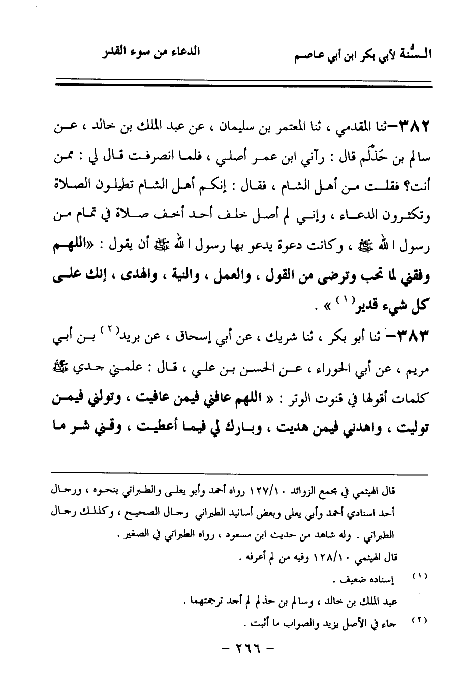 382 - حَدَّثنا الْمُقَدَّمِيُّ، حَدَّثنا الْمُعْتَمِرُ بْنُ سُلَيْمَانَ، عَنْ عَبْدِ الْمَلِكِ بْنِ خَالِدٍ، عَنْ سَالِمِ بْنِ حَذْلَمٍ، قَالَ: رَآنِي ابْنُ عُمَرَ أُصَلِّي، فَلَمَّا انْصَرَفْتُ, قَالَ لِي: مِمَّنْ أَنْتَ؟ فَقُلْتُ: مِنْ أَهْلِ الشَّامِ، فَقَالَ: إِنَّكُمْ أَهْلَ الشَّامِ تُطِيلُونَ الصَّلاَةَ، وَتُكْثِرُونَ الدُّعَاءَ، وَإِنِّي لَمْ أُصَلِّ خَلْفَ أَحَدٍ أَخَفِّ صَلاَةٍ فِي تَمَامٍ مِنْ رَسُولِ اللهِ صَلى الله عَلَيهِ وسَلمَ، وَكَانَتْ دَعْوَةٌ يَدْعُو بِهَا رَسُولُ اللهِ صَلى الله عَلَيهِ وسَلمَ أَنْ يَقُولَ: اللهُمَّ وَفِّقْنِي لِمَا تُحِبُّ وَتَرْضَى مِنَ الْقَوْلِ وَالْعَمَلِ وَالنِّيَّةِ وَالْهُدَى، إِنَّكَ عَلَى كُلِّ شَيْءٍ قَدِيرٌ.