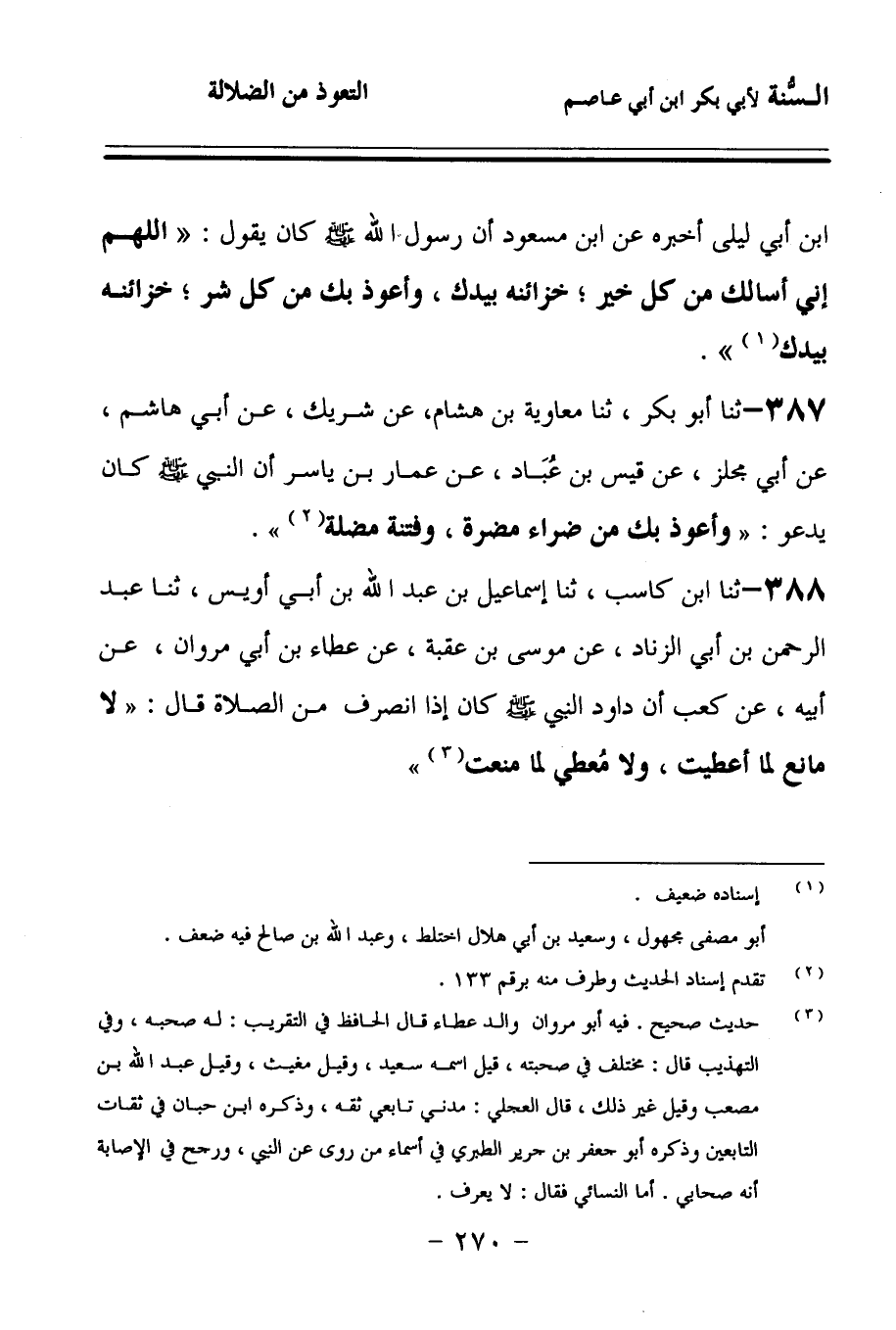 387 - حَدَّثنا أَبُو بَكْرٍ، حَدَّثنا مُعَاوِيَةُ بْنُ هِشَامٍ، عَنْ شَرِيكٍ، عَنْ أَبِي هَاشِمٍ، عَنْ أَبِي مِجْلَزٍ، عَنْ قَيْسِ بْنِ عُبَادٍ، عَنْ عَمَّارِ بْنِ يَاسِرٍ، أَنَّ النَّبِيَّ صَلى الله عَلَيهِ وسَلمَ كَانَ يَدْعُو: وَأَعُوذُ بِكَ مِنْ ضَرَّاءٍ مُضِرَّةٍ، وَفِتْنَةٍ مُضِلَّةٍ.