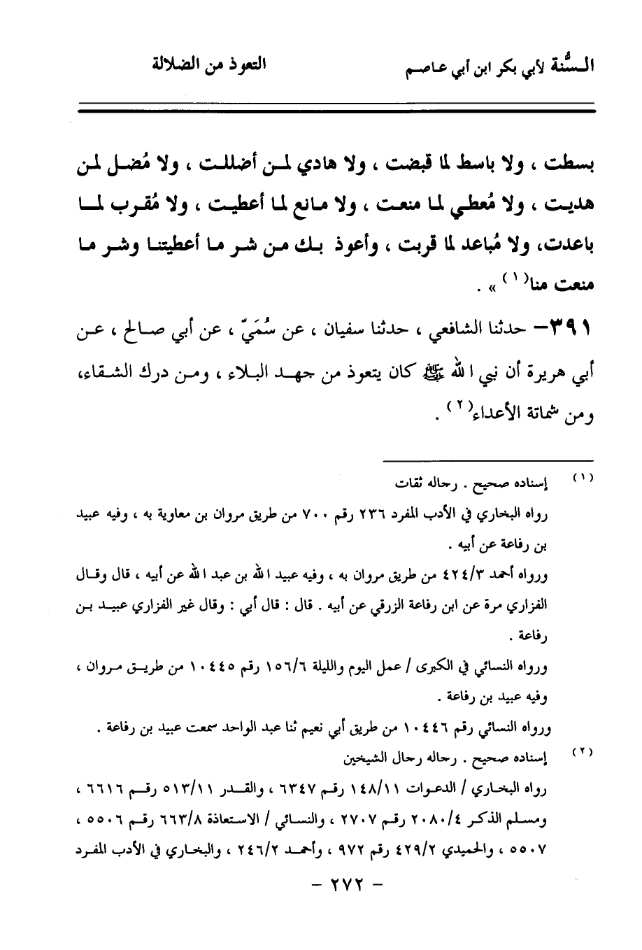 391 - حَدَّثنا الشَّافِعِيُّ, حَدَّثنا سُفْيَانُ، عَنْ سُمَيٍّ، عَنْ أَبِي صَالِحٍ، عَنْ أَبِي هُرَيْرَةَ، أَنَّ نَبِيَّ اللهِ صَلى الله عَلَيهِ وسَلمَ كَانَ يَتَعَوَّذُ مِنْ جَهْدِ الْبَلاَءِ، وَمِنْ دَرَكِ الشَّقَاءِ، وَمِنْ شَمَاتَةِ الأَعْدَاءِ.