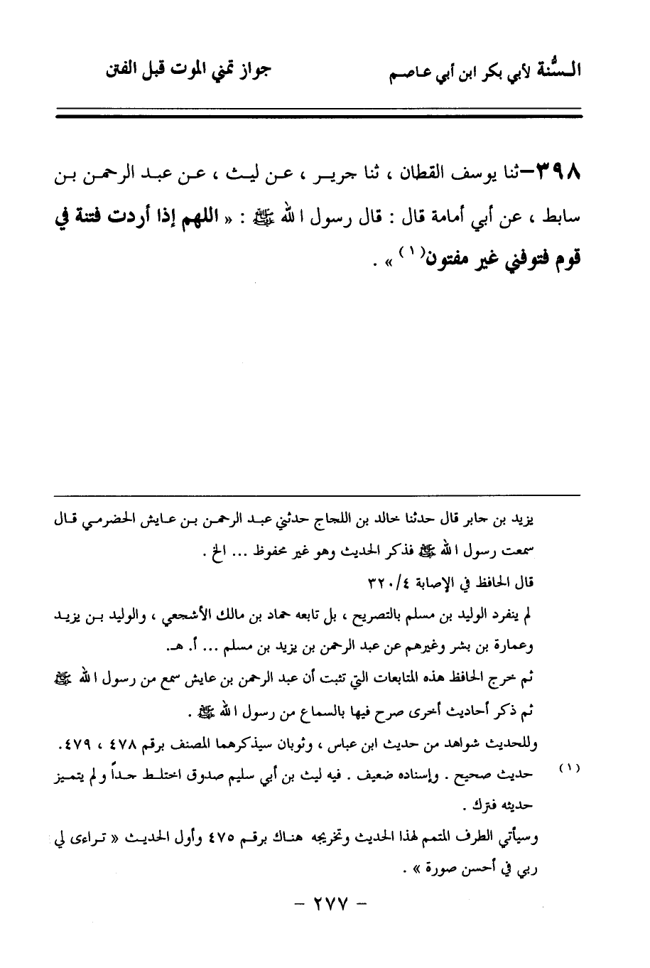 398 - حَدَّثنا يُوسُفُ الْقَطَّانُ، حَدَّثنا جَرِيرٌ، عَنْ لَيْثٍ، عَنْ عَبْدِ الرَّحْمَنِ بْنِ سَابِطٍ، عَنْ أَبِي أُمَامَةَ، قَالَ: قَالَ رَسُولُ اللهِ صَلى الله عَلَيهِ وسَلمَ: اللهُمَّ إِذَا أَرَدْتَ فِتْنَةً فِي قَوْمٍ, فَتَوَفَّنِي غَيْرَ مَفْتُونٍ.