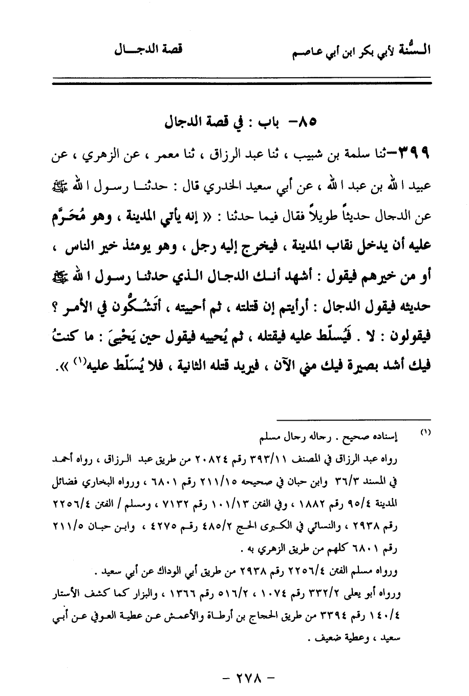 399 - حَدَّثنا سَلَمَةُ بْنُ شَبِيبٍ، حَدَّثنا عَبْدُ الرَّزَّاقِ، حَدَّثنا مَعْمَرٌ، عَنِ الزُّهْرِيِّ، عَنْ عُبَيْدِ اللهِ بْنِ عَبْدِ اللهِ، عَنْ أَبِي سَعِيدٍ الْخُدْرِيِّ، قَالَ: حَدَّثنا رَسُولُ اللهِ صَلَّىُ اللهُ عَلَيْهِ وَسَلَّمَ عَنِ الدَّجَّالِ حَدِيثًا طَوِيلاً، فَقَالَ فِيمَا حَدَّثنا: إِنَّهُ يَأْتِي الْمَدِينَةَ وَهُوَ مُحَرَّمٌ عَلَيْهِ أَنْ يَدْخُلَ نِقَابَ الْمَدِينَةِ، فَيَخْرُجُ إِلَيْهِ رَجُلٌ، وَهُوَ يَوْمَئِذٍ خَيْرُ النَّاسِ, أَوْ مِنْ خَيْرِهِمْ, فَيَقُولُ: أَشْهَدُ أَنَّكَ الدَّجَّالُ الَّذِي حَدَّثنا رَسُولُ اللهِ صَلَّىُ اللهُ عَلَيْهِ وَسَلَّمَ حَدِيثَهُ، فَيَقُولُ الدَّجَّالُ: أَرَأَيْتُمْ إِنْ قَتَلْتُهُ, ثُمَّ أَحْيَيْتُهُ، أَتَشُكُّونَ فِي الأَمْرِ؟ فَيَقُولُونَ: لاَ، فَيُسَلَّطُ عَلَيْهِ فَيَقْتُلُهُ, ثُمَّ يُحْيِيهِ، فَيَقُولُ حِينَ يَحْيَى: مَا كُنْتُ فِيكَ أَشَدَّ بَصِيرَةً فِيكَ مِنِّي الآنَ، فَيُرِيدُ قَتْلَهُ الثَّانِيَةَ فَلاَ يُسَلَّطُ عَلَيْهِ, قَالَ أَبُو بَكْرٍ: فَاللهُ سَلَّطَهُ فِي الاِبْتِدَاءِ عَلَى قَتْلِهِ وَإِحْيَائِهِ، ثُمَّ مَنَعَهُ مِنَ الثَّانِيَةِ.