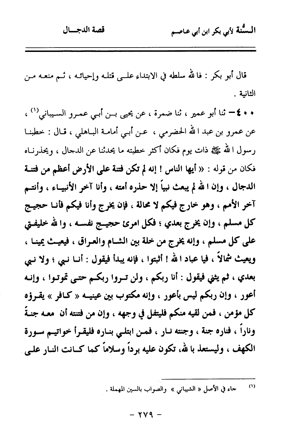 400 - حَدَّثنا أَبُو عُمَيْرٍ، حَدَّثنا ضَمْرَةُ، عَنْ يَحْيَى بْنِ أَبِي عَمْرٍو السَّيْبَانِيِّ، عَنْ عَمْرِو بْنِ عَبْدِ اللهِ الْحَضْرَمِيِّ، عَنْ أَبِي أُمَامَةَ الْبَاهِلِيِّ، قَالَ: خَطَبَنَا رَسُولُ اللهِ صَلى الله عَلَيهِ وسَلمَ ذَاتَ يَوْمٍ، فَكَانَ أَكْثَرَ خُطْبَتِهِ مَا يُحَدِّثُنَا عَنِ الدَّجَّالِ وَيُحَذِّرُنَاهُ، فَكَانَ مِنْ قَوْلِهِ: أَيُّهَا النَّاسُ, إِنَّهُ لَمْ تَكُنْ فِتْنَةٌ عَلَى الأَرْضِ أَعْظَمَ مِنْ فِتْنَةِ الدَّجَّالِ، وَإِنَّ اللهَ لَمْ يَبْعَثْ نَبِيًّا إِلاَّ حَذَّرَهُ أُمَّتَهُ، وَأَنَا آخِرُ الأَنْبِيَاءِ, وَأَنْتُمْ آخِرُ الأُمَمِ، وَهُوَ خَارِجٌ فِيكُمْ لاَ مَحَالَةَ، فَإِنْ يَخْرُجْ وَأَنَا فِيكُمْ, فَأَنَا حَجِيجُ كُلِّ مُسْلِمٍ، وَإِنْ يَخْرُجْ بَعْدِي, فَكُلُّ امْرِئٍ حَجِيجُ نَفْسِهِ، وَاللهُ خَلِيفَتِي عَلَى كُلِّ مُسْلِمٍ، وَإِنَّهُ يَخْرُجُ مِنْ خلَّةٍ بَيْنَ الشَّامِ وَالْعِرَاقِ, فَيَعِيثُ يَمِينًا, وَيَعِيثُ شِمَالاً، فَيَا عِبَادَ اللهِ، اثْبُتُوا, فَإِنَّهُ يَبْدَأُ فَيَقُولُ: أَنَا نَبِيٌّ، وَلاَ نَبِيَّ بَعْدِي، ثُمَّ يُثَنِّي فَيَقُولُ: أَنَا رَبُّكُمْ، وَلَنْ تَرَوْا رَبَّكُمْ حَتَّى تَمُوتُوا، وَإِنَّهُ أَعْوَرُ، وَإِنَّ رَبَّكُمْ لَيْسَ بِأَعْوَرَ، وَإِنَّهُ مَكْتُوبٌ بَيْنَ عَيْنَيْهِ: كَافِرٌ، يَقْرَؤُهُ كُلُّ مُؤْمِنٍ، فَمَنْ لَقِيَهُ مِنْكُمْ, فَلْيَتْفُلْ فِي وَجْهِهِ، وَإِنَّ مِنْ فِتْنَتِهِ أَنَّ مَعَهُ جَنَّةً وَنَارًا، فَنَارُهُ جَنَّةٌ, وَجَنَّتُهُ نَارٌ، فَمَنِ ابْتُلِيَ بِنَارِهِ, فَلْيَقْرَأْ خَوَاتِيمَ سُورَةِ الْكَهْفِ, وَلْيَسْتَعِذْ بِاللهِ, تَكُونُ عَلَيْهِ بَرْدًا وَسَلاَمًا، كَمَا كَانَتِ النَّارُ عَلَى إِبْرَاهِيمَ،