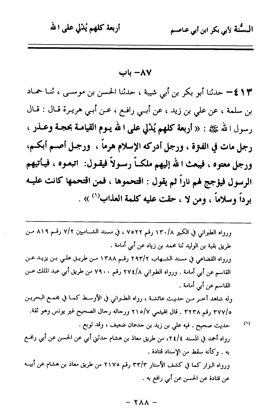 413 - حَدَّثنا أَبُو بَكْرِ بْنُ أَبِي شَيْبَةَ، حَدَّثنا الْحَسَنُ بْنُ مُوسَى، حَدَّثنا حَمَّادُ بْنُ سَلَمَةَ، عَنْ عَلِيِّ بْنِ زَيْدٍ، عَنْ أَبِي رَافِعٍ، عَنْ أَبِي هُرَيْرَةَ، قَالَ: قَالَ رَسُولُ اللهِ صَلى الله عَلَيهِ وسَلمَ: أَرْبَعَةٌ كُلُّهُمْ يُدْلِي عَلَى اللهِ يَوْمَ الْقِيَامَةِ بِحُجَّةٍ وَعُذْرٍ: رَجُلٌ مَاتَ فِي الْفَتْرَةِ، وَرَجُلٌ أَدْرَكَهُ الإِسْلاَمُ هَرَمًا، وَرَجُلٌ أَصَمُّ أَبْكَمُ، وَرَجُلٌ مَعْتُوهٌ، فَيَبْعَثُ اللهُ إِلَيْهِمْ مَلَكًا رَسُولاً فَيَقُولُ: اتَّبِعُوهُ، فَيَأْتِيهِمُ الرَّسُولُ فَيُؤَجِّجُ لَهُمْ نَارًا، ثُمَّ يَقُولُ: اقْتَحِمُوهَا، فَمَنِ اقْتَحَمَهَا كَانَتْ عَلَيْهِ بَرْدًا وَسَلاَمًا، وَمَنْ لاَ، حَقَّتْ عَلَيْهِ كَلِمَةُ الْعَذَابِ.