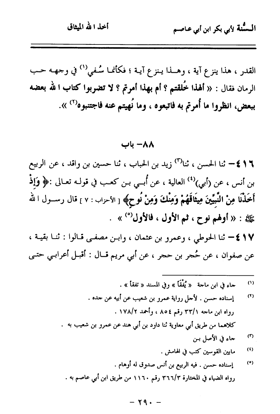 416 - حَدَّثنا الْحَسَنُ، حَدَّثنا زَيْدُ بْنُ الْحُبَابِ، حَدَّثنا حُسَيْنُ بْنُ وَاقِدٍ، عَنِ الرَّبِيعِ بْنِ أَنَسٍ، عَنْ أَبِي الْعَالِيَةِ، عَنْ أُبَيِّ بْنِ كَعْبٍ، فِي قَوْلِهِ تَعَالَى: {وَإِذْ أَخَذْنَا مِنَ النَّبِيِّينَ مِيثَاقَهُمْ وَمِنْكَ وَمِنْ نُوحٍ}، قَالَ رَسُولُ اللهِ صَلى الله عَلَيهِ وسَلمَ: أَوَّلُهُمْ نُوحٌ، ثُمَّ الأَوَّلُ فَالأَوَّلُ.