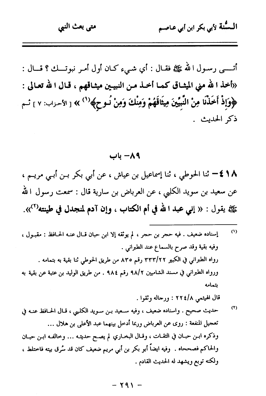 418 - حَدَّثنا الْحَوْطِيُّ، حَدَّثنا إِسْمَاعِيلُ بْنُ عَيَّاشٍ، عَنْ أَبِي بَكْرِ بْنِ أَبِي مَرْيَمَ، عَنْ سَعِيدِ بْنِ سُوَيْدٍ الْكَلْبِيِّ، عَنِ الْعِرْبَاضِ بْنِ سَارِيَةَ، قَالَ: سَمِعْتُ رَسُولَ اللهِ صَلى الله عَلَيهِ وسَلمَ يَقُولُ: إِنِّي عَبْدُ اللهِ فِي أُمِّ الْكِتَابِ، وَإِنَّ آدَمَ لَمُنْجَدِلٌ فِي طِينَتِهِ.