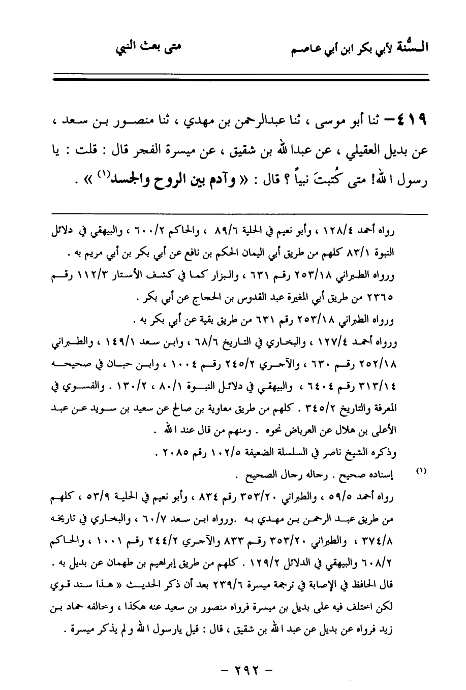 419 - حَدَّثنا أَبُو مُوسَى، حَدَّثنا عَبْدُ الرَّحْمَنِ بْنُ مَهْدِيٍّ، حَدَّثنا مَنْصُورُ بْنُ سَعْدٍ، عَنْ بُدَيْلٍ الْعُقَيْلِيِّ، عَنْ عَبْدِ اللهِ بْنِ شَقِيقٍ، عَنْ مَيْسَرَةَ الْفَجْرِ، قَالَ: قُلْتُ: يَا رَسُولَ اللهِ, مَتَى كُتِبْتَ نَبِيًّا؟ قَالَ: وَآدَمُ بَيْنَ الرُّوحِ وَالْجَسَدِ.