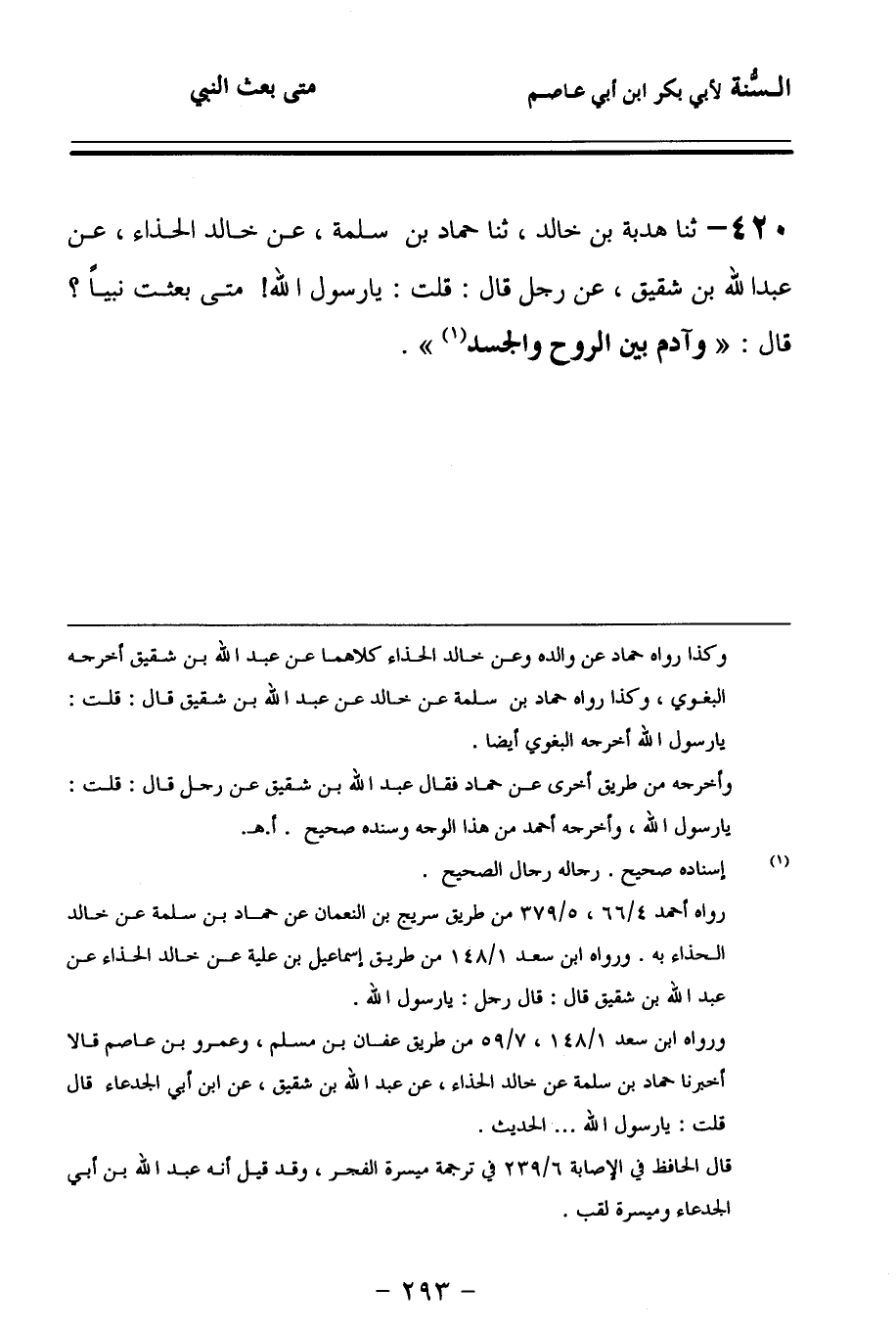 420 - حَدَّثنا هُدْبَةُ بْنُ خَالِدٍ، حَدَّثنا حَمَّادُ بْنُ سَلَمَةَ، عَنْ خَالِدٍ الْحَذَّاءِ، عَنْ عَبْدِ اللهِ بْنِ شَقِيقٍ، عَنْ رَجُلٍ، قَالَ: قُلْتُ: يَا رَسُولَ اللهِ, مَتَى بُعِثْتَ نَبِيًّا؟ قَالَ: وَآدَمُ بَيْنَ الرُّوحِ وَالْجَسَدِ.